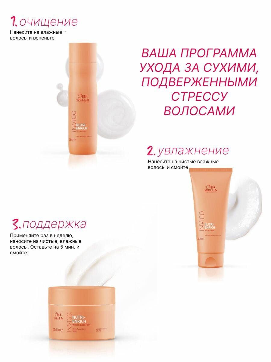 | Дополнительная информация | Мгновенно увлажняет сухие, подверженные стрессу волосы, придает волосам эластичность и жизненную силу. С формулой Nutri-Enrich-Бленд: Олеиновая кислота и пантенол обеспечивают увлажнение и питание волос, а витамин Е защищает волосы от дальнейшего повреждения. Ягоды Годжи являются богатейшим источником витаминов, минералов и пептидов. |