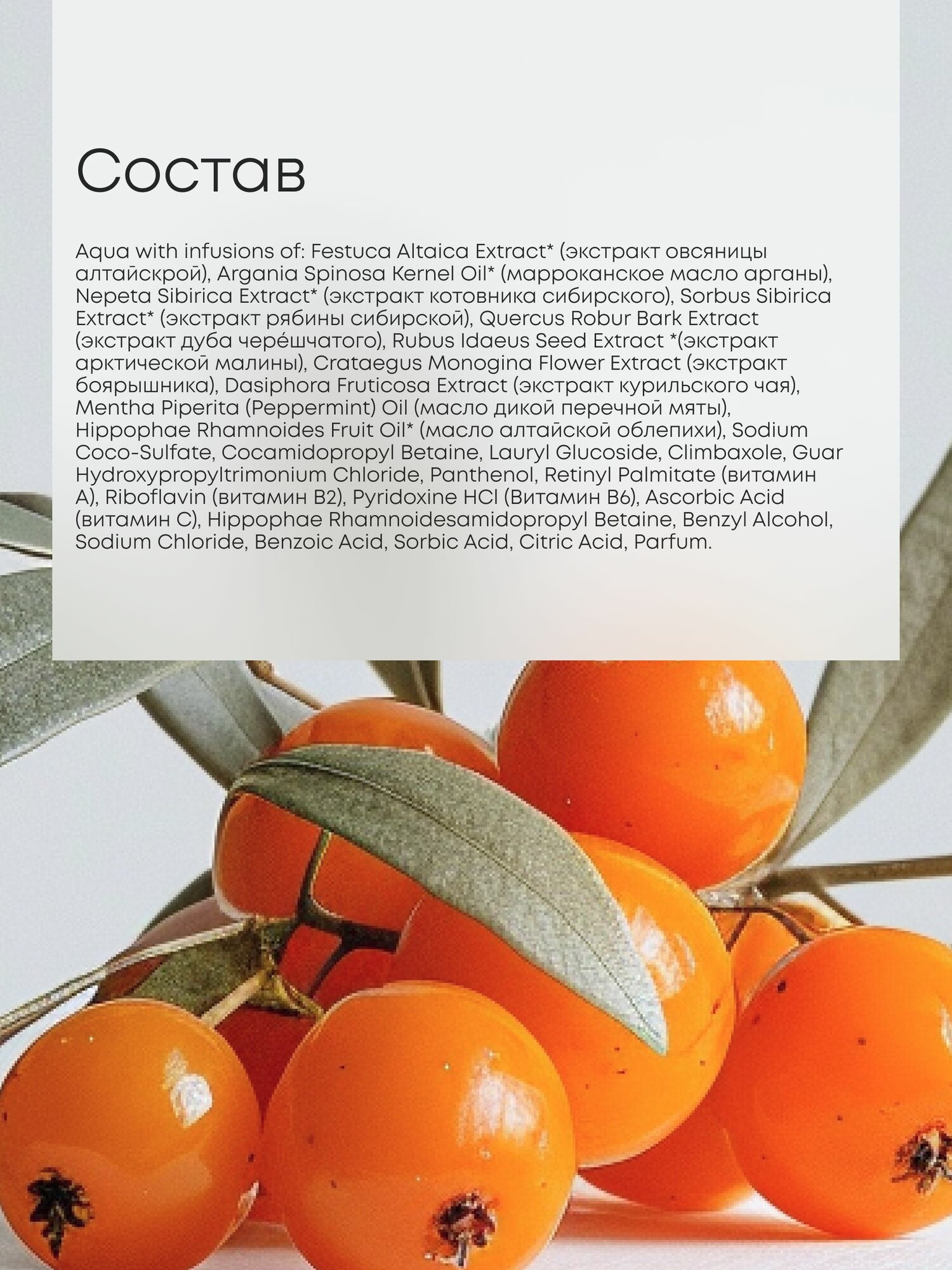 | Состав | aqua with infusions of: achillea asiatica extract (экстракт тысячелистника азиатского), viburnum opulus barc extract (экстракт калины), larix sibirica needle extract (экстракт лиственницы сибирской), argania spinosa kernel oil (марокканское масло арганы ), trifolium pratenseflower extract (экстракт клевера лугового), linum usitatissimum (linseed) seed oil (масло белого сибирского льна), rosa daurica fruit oil (масло даурского шиповника), hippophae rhamnoides fruit oil (масло алтайской облепихи), sodium coco-sulfate, coco-glucoside, glyceryloleate, guar hydroxypropyltrimonium chloride, hydrolyzed wheat protein, thiamine nitrate (витамин b1), tocopherol, cyanocobalamin (витаминb12), hippophae rhamnoidesamidopropyl betaine, benzyl alcohol, sodium chloride, benzoic acid, sorbic acid, citric acid, parfum |