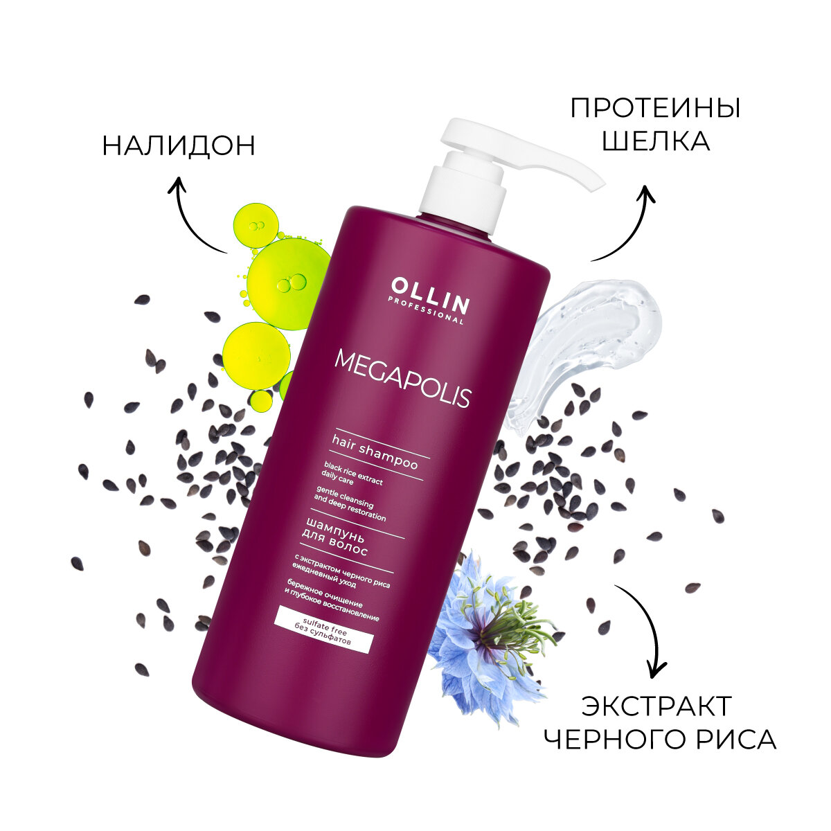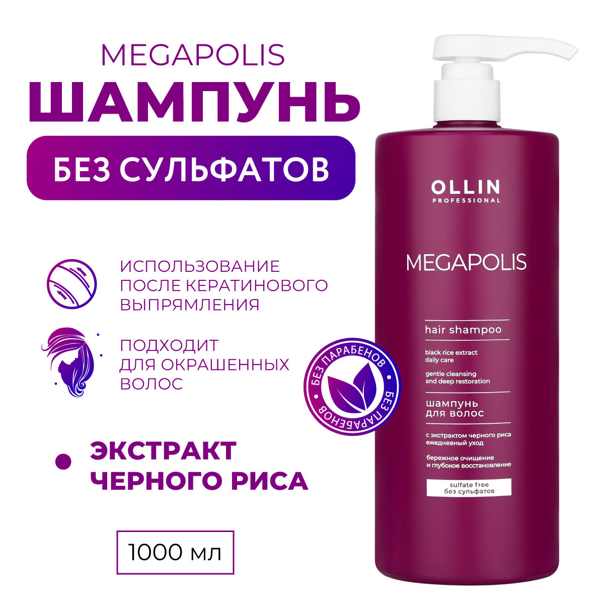 OLLIN MEGAPOLIS Шампунь с экстрактом черного риса 1000мл (без сульфатов и парабенов)