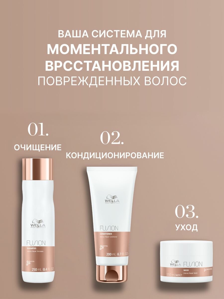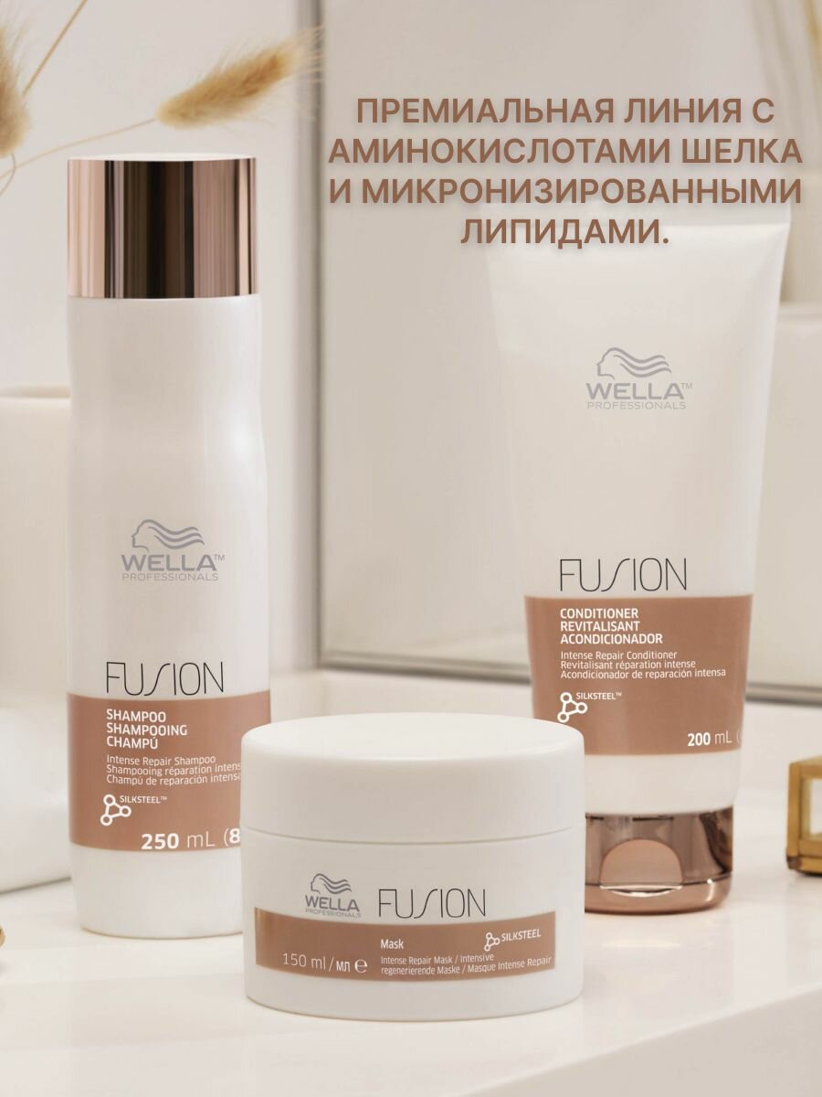 | Дополнительная информация | Бережное очищение и укрепление волос для предотвращения их ломкости с шампунем для интенсивного восстановления волос Wella Professionals Fusion. Благодаря входящим в состав аминокислотам шелка этот профессиональный шампунь для поврежденных волос восстанавливает, бережно очищает и питает волосы. Шампунь быстро восстанавливает структуру волос, поврежденную во время расчесывания и механического воздействия. В связи с редизайном упаковки товар может прийти как с широким, так и с узким горлышком |