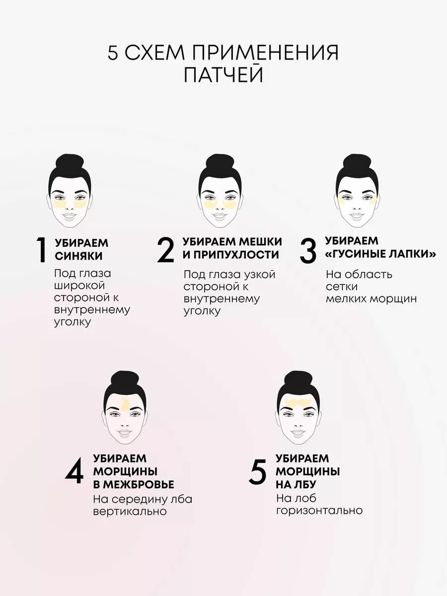 | Способ применения | нанесите патчи на очищенную область под глазами и/или на области, склонные к появлению мимических морщин, Оставьте на 15-20 минут. Вбейте остатки сыворотки кончиками пальцев до полного впитывания, Нанесите крем для век, Подходят для ежедневного применения |