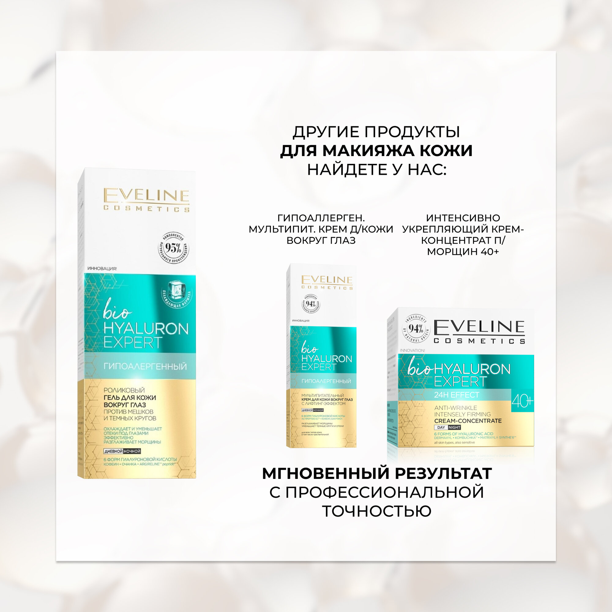 Ниже Вы можете прочитать отзывы на Роликовый гель для кожи вокруг глаз EVELINE bioHYALURON EXPERT гипоаллергенный против мешков и темных кругов, 15 мл, ознакомится с подробными характеристиками, посмотреть интересные обзоры и фотографии на Роликовый гель для кожи вокруг глаз EVELINE bioHYALURON EXPERT гипоаллергенный против мешков и темных кругов, 15 мл.