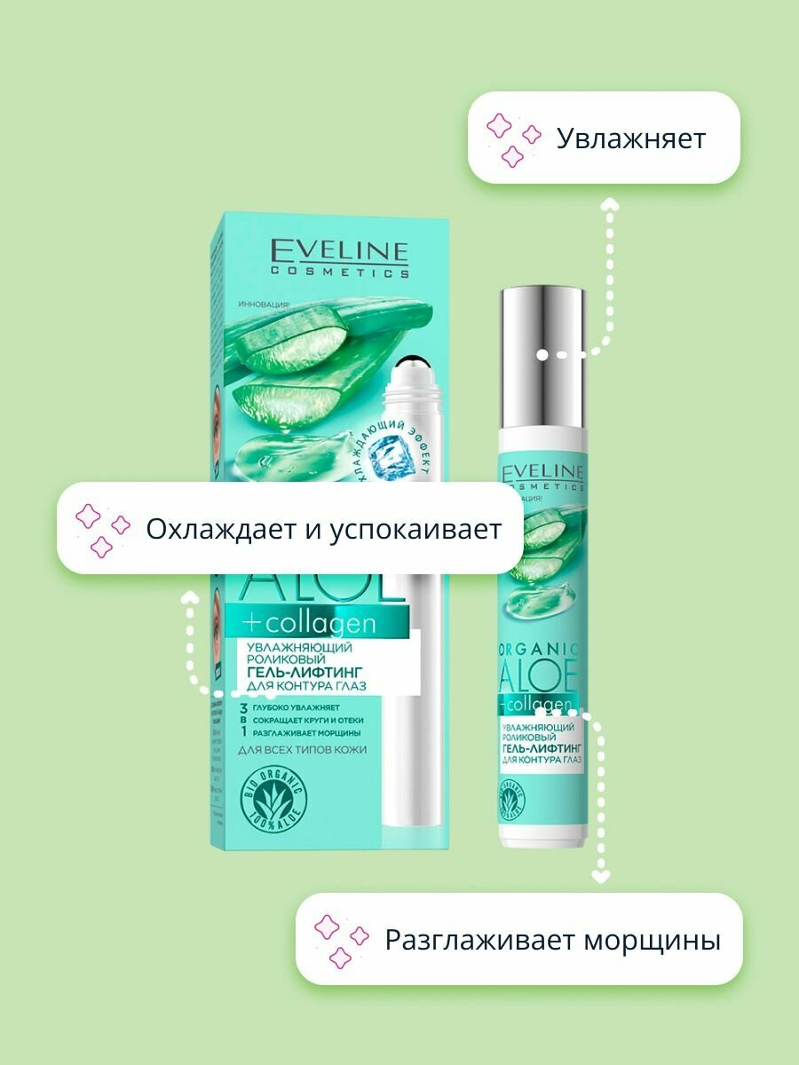 EVELINE ORGANIC ALOE+COLLAGEN Увлажняющий роликовый гель-лифтинг для контура глаз, 15мл