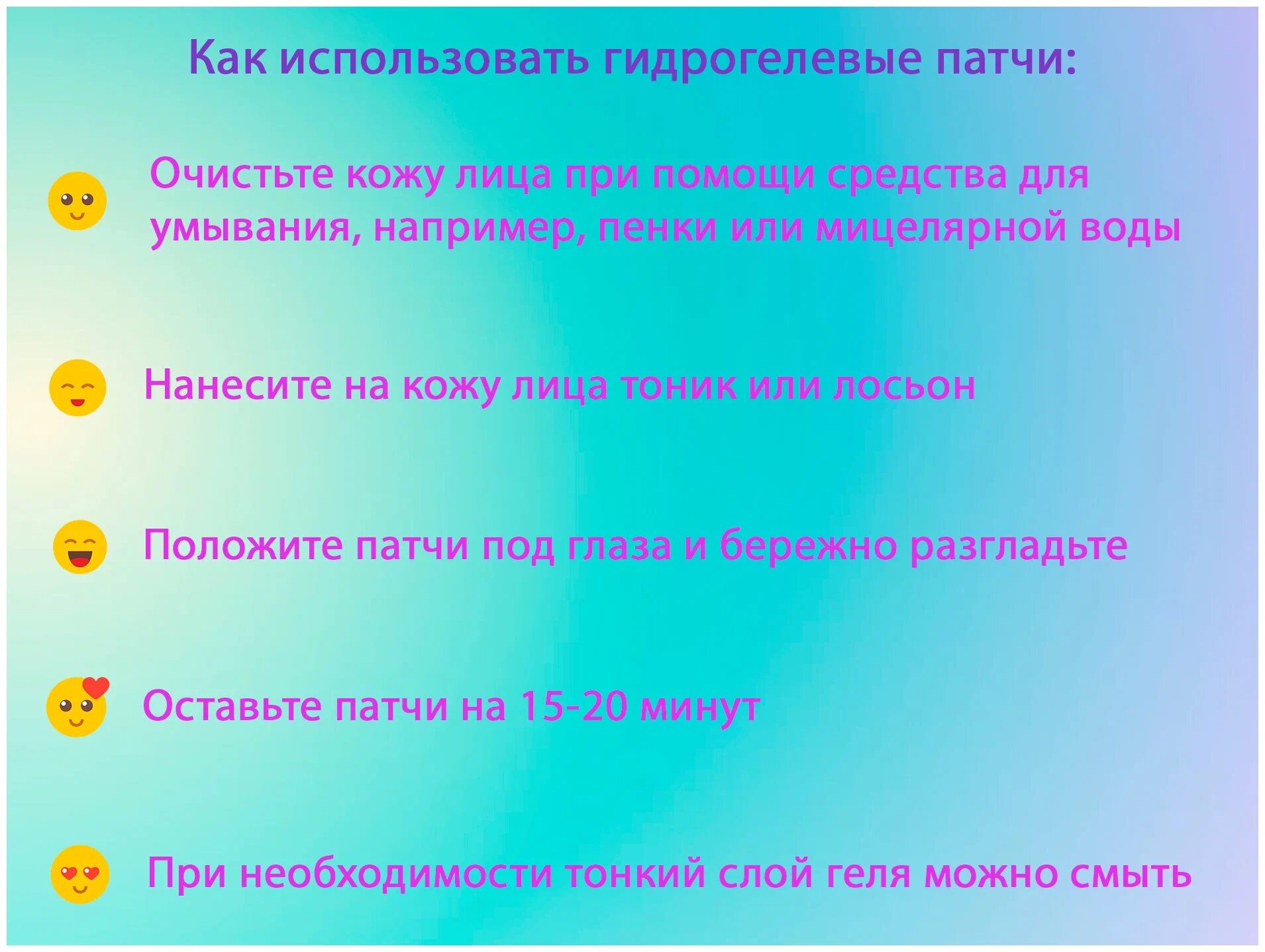 | Способ применения | извлечь патчи из банки специальной ложечкой. Приложить на кожу под глазами, область лба или носогубные складки. Удалить через 30-40 минут. Остатки эссенции не смывать, втереть в кожу. Рекомендуется регулярное применение, средство обеспечивает накопительный эффект |