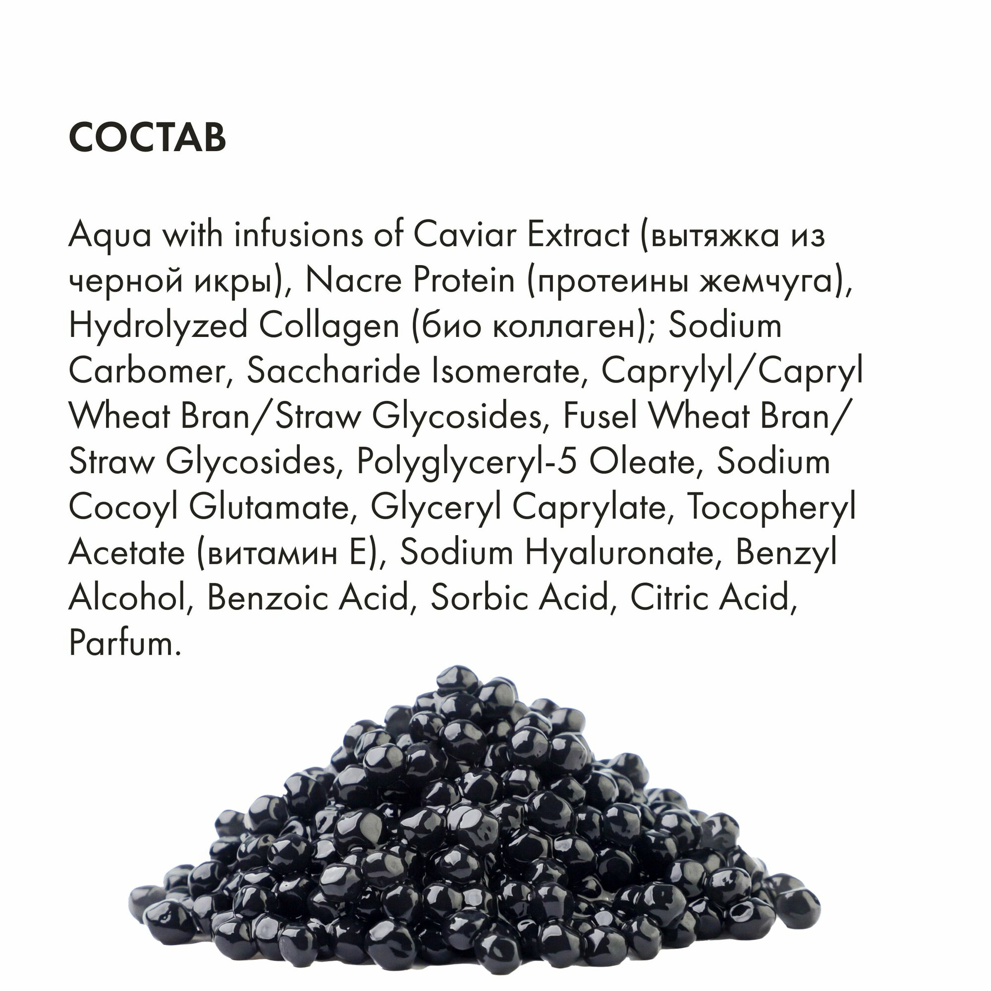 | Состав | Aqua with infusions of Caviar Extract (вытяжка из черной икры), Nacre Protein (протеины жемчуга), Hydrolyzed Collagen (био коллаген); Sodium Carbomer, Saccharide Isomerate, Caprylyl/Capryl Wheat Bran/Straw Glycosides, Fusel Wheat Bran/Straw Glycosides, Polyglyceryl-5 Oleate, Sodium Cocoyl Glutamate, Glyceryl Caprylate, Tocopheryl Acetate (витамин Е), Sodium Hyaluronate, Benzyl Alcohol, Benzoic Acid, Sorbic Acid, Citric Acid, Parfum. |