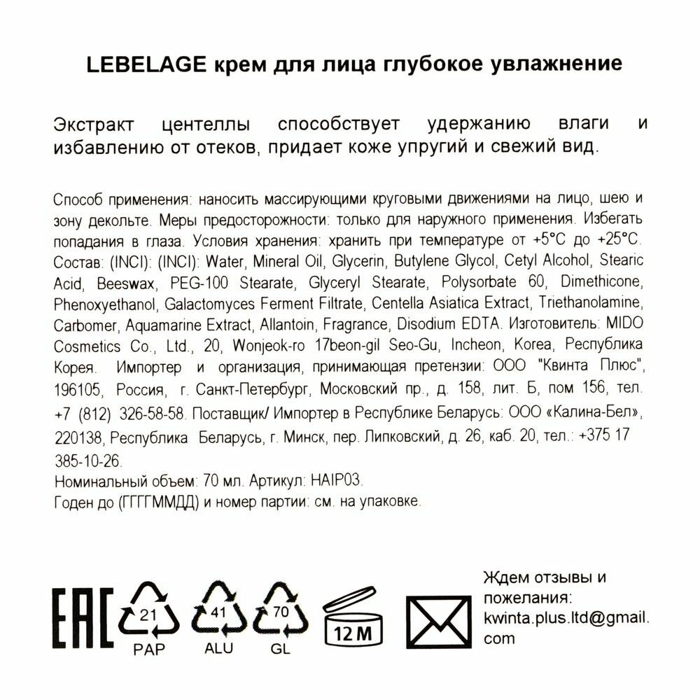 LEBELAGE Интенсивно увлажняющий крем для ухода за кожей лица, шеи и зоны декольте с гиалуроновой кислотой, корейская косметика. 70мл