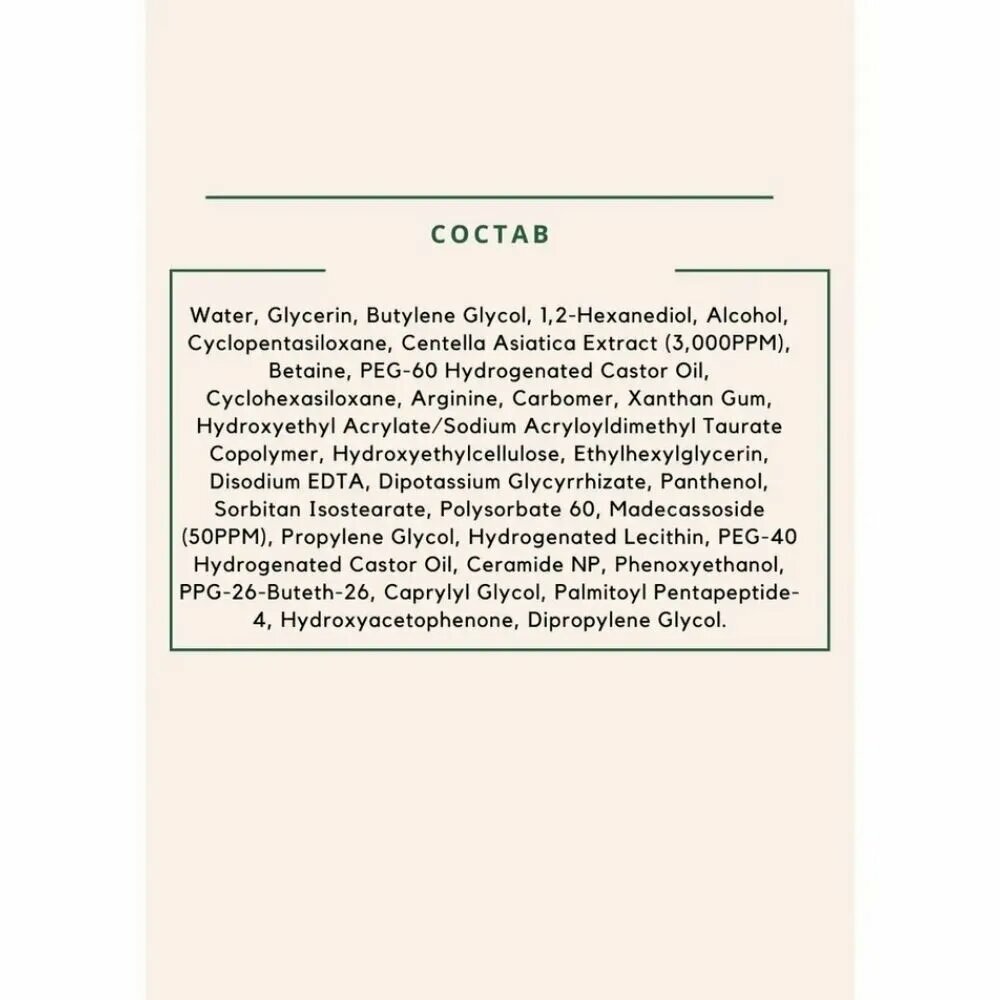 | Состав | water glycerin butylene glycol 12-hexanediol alcohol cyclopentasiloxane centella asiatica extract 3.oooppm), betaine peg-60 hydrogenated castor oil cyclohexasilokane arginine carbomer xanthan gum hydrokye thyl acrylate/sodium acryloyldimethyl taurate copolymer, hydroxyethylcellllose ethylhexylgycern disodi edta dipotassium glycyrrhizate panthenol sorbitan isostearate polysorsate 60. m glycol hydrogenated lecithin peg-4o hydrogenated castor oil ceramide np phenokyethanol ppg-26-buteth2 cap rylyl glycol palmitoyl pentapeptide-4 hydroxyacetophenone dipropylene glycol |