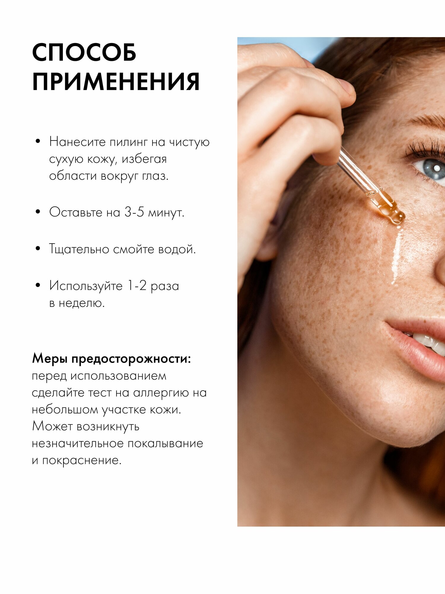 | Способ применения | Нанесите пилинг на чистую сухую кожу, избегая области вокруг глаз, оставьте на 3-5 минут. Тщательно смойте водой. Рекомендуем использовать «Тоник для лица нейтрализатор пилинга» и «Крем для лица после пилинга» коллекции SKIN SUPER FOOD. Использовать 1-2 раза в неделю.Меры предосторожности: перед использованием проверьте на небольшом участке кожи на отсутствие аллергии. Может возникнуть незначительное покалывание и покраснение кожи. |