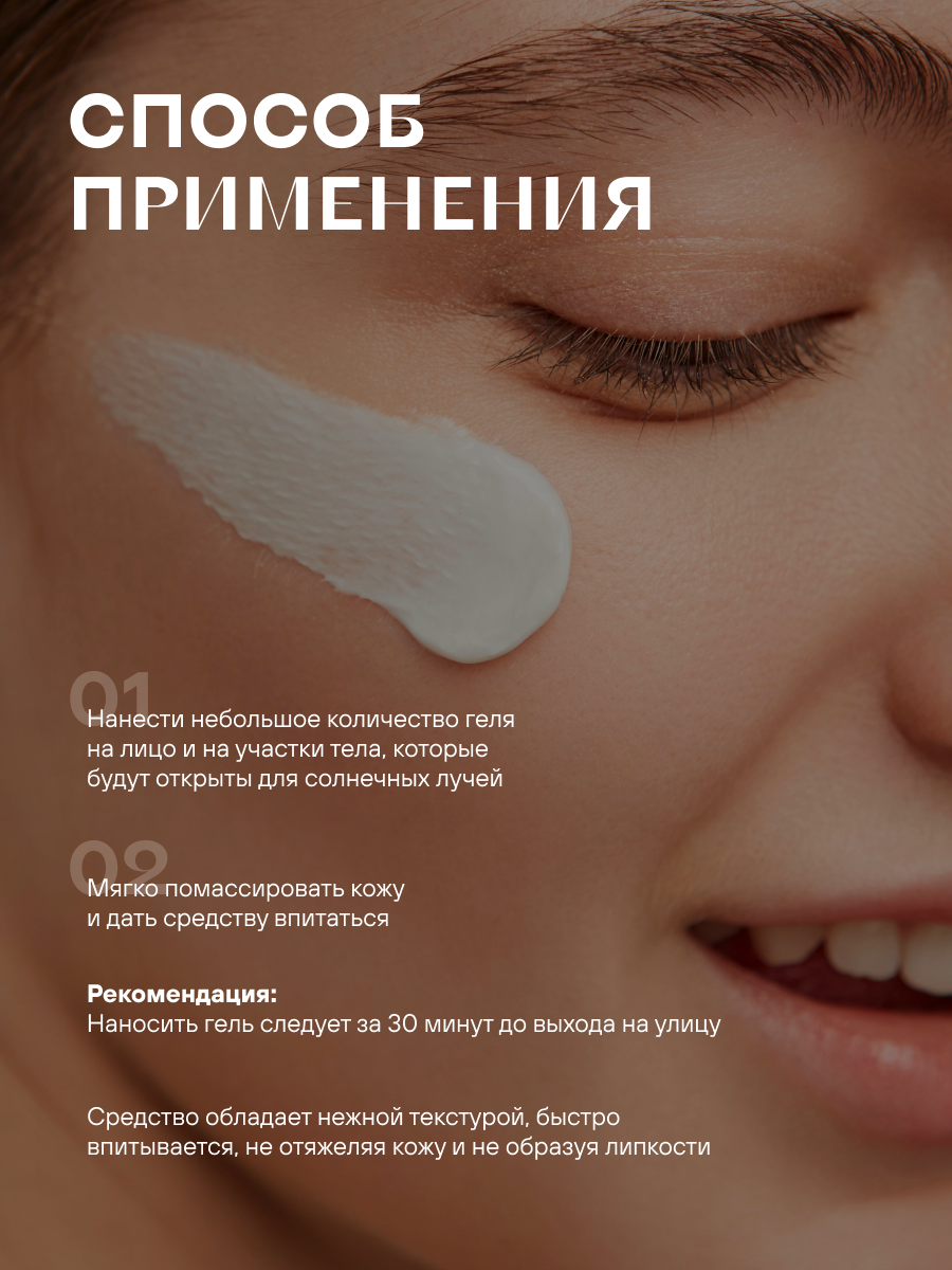 | Способ применения | Нанесите небольшое количество геля на лицо и на участки тела, которые будут открыты для солнечных лучей. Мягко помассируйте кожу и дайте средству впитаться. Наносить гель следует за 30 минут до выхода на улицу. |
