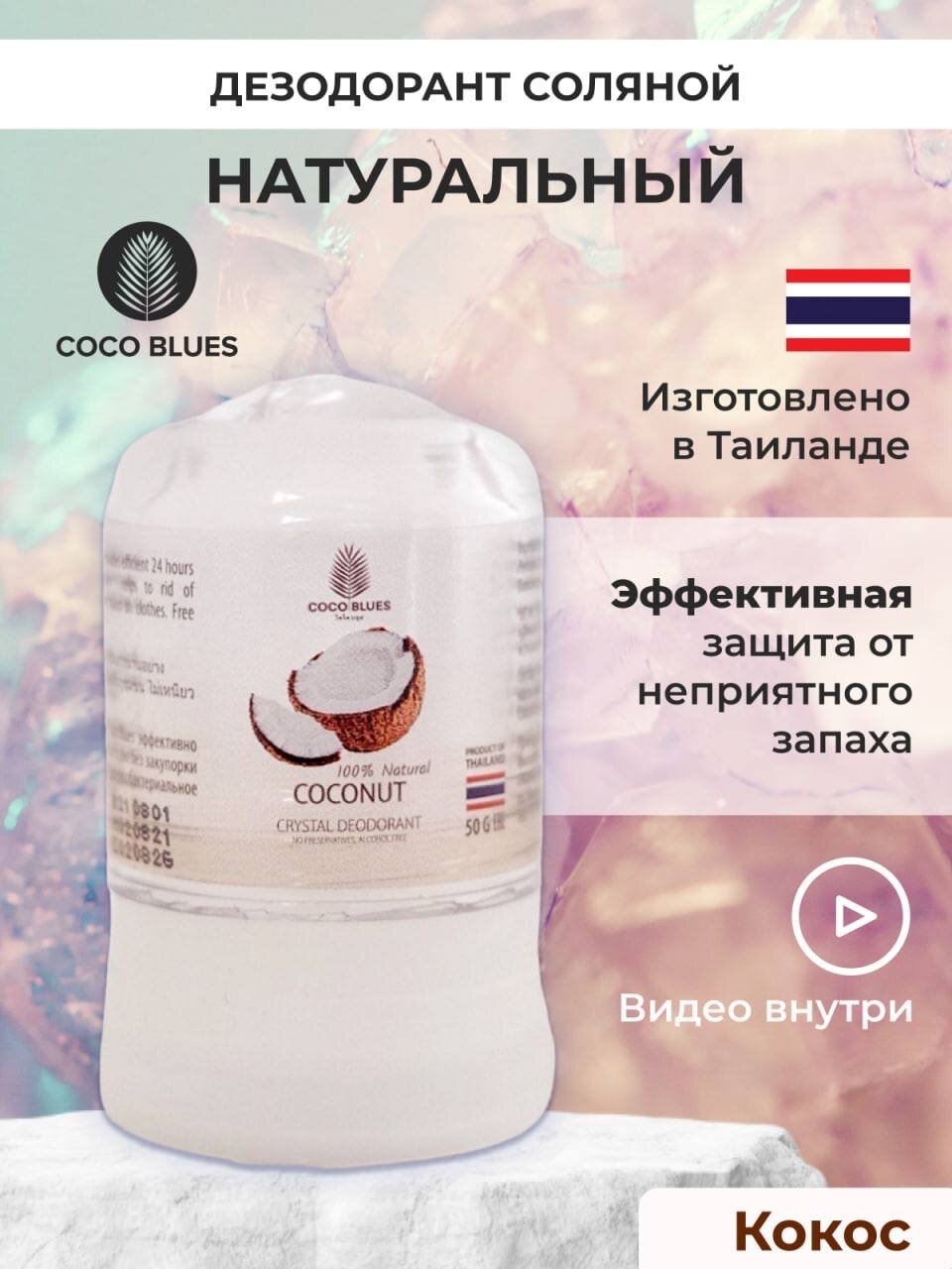Купить COCO BLUES Тайский натуральный дезодорант кристалл соляной против запаха пота для женщин и мужчин 50 гр, экстракт кокоса