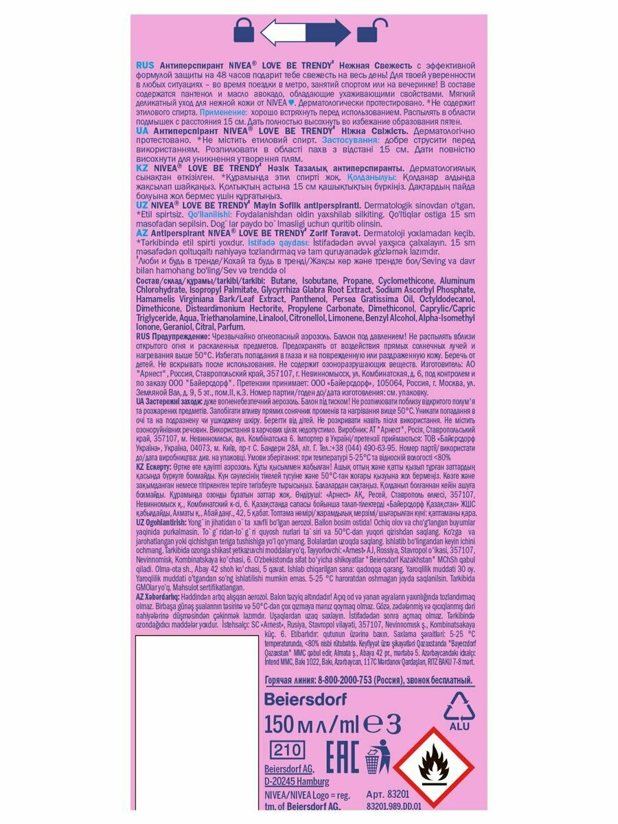NIVEA Антиперспирант Love Be Trendy Нежная свежесть, спрей, аэрозоль, 150 мл, 134 г, 1 шт. интересное:
