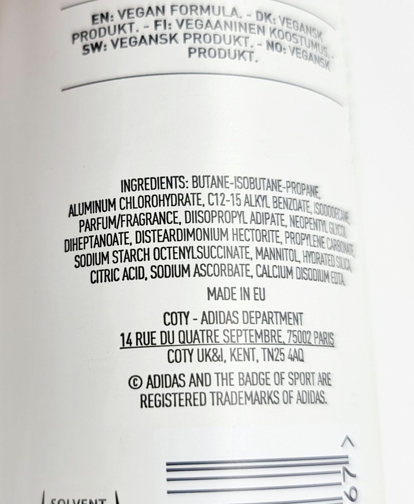 | Полный состав | бутан-изобутан-пропан, хлоргидрат алюминия, c12-15 алкилбензоат, изододекан, отдушки/аромат, дизопропиладипат, неопентел гликоля дигептандат, дистардимониевый гекторит, пропилен карбонат, натрий крахмал тенилсукцинат, мальтоза, хем цинамал, цитрат калия, лимонная кислота , кремнемель диметилсилклат, бензилбензоат. |