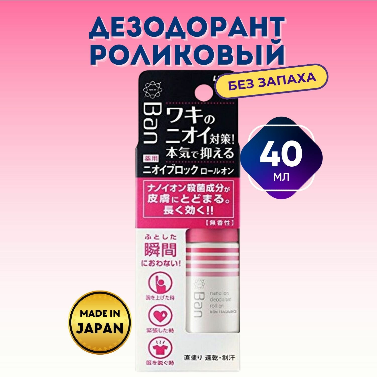 LION Ban Roll On Дезодорант-антиперспирант роликовый, нано-ионный, без аромата, 40мл.
