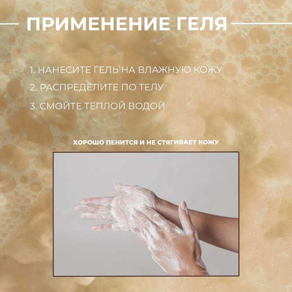 | Способ применения | Выдавить немного геля на влажную мочалку или кожу, помассировать ее 2 минуты и смыть пену водой. |