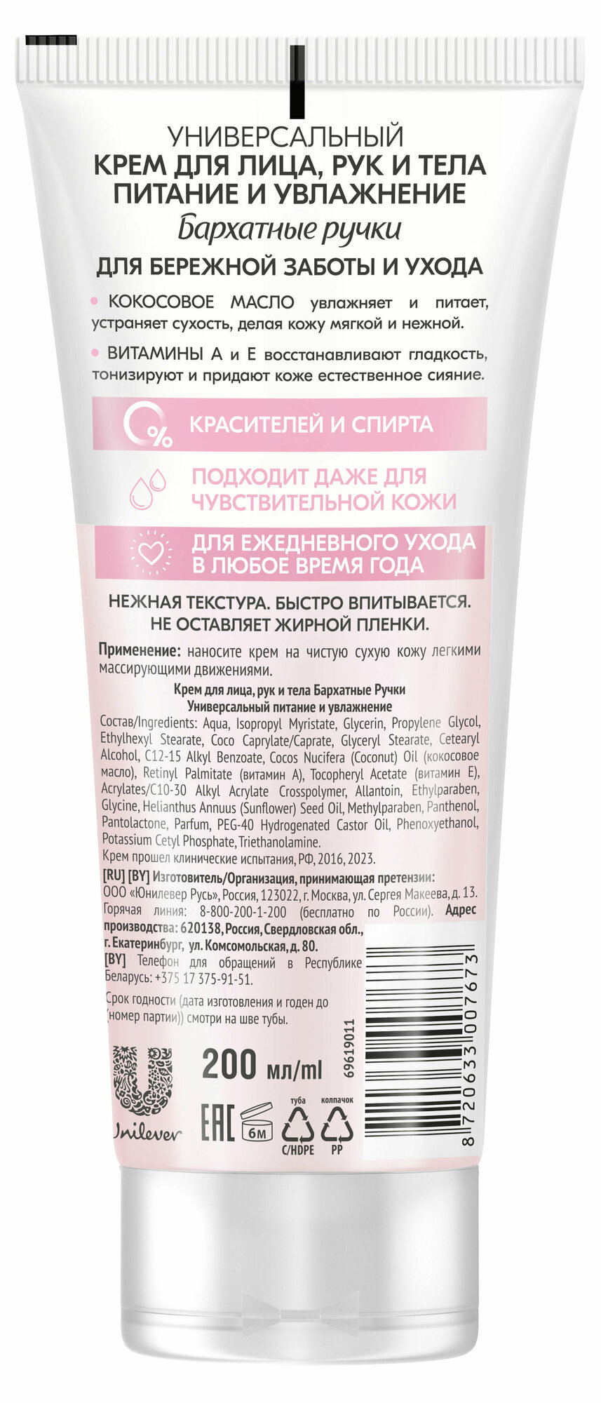 Бархатные ручки крем для лица, рук и тела Универсальный питание и увлажнение, 200 мл интересное: