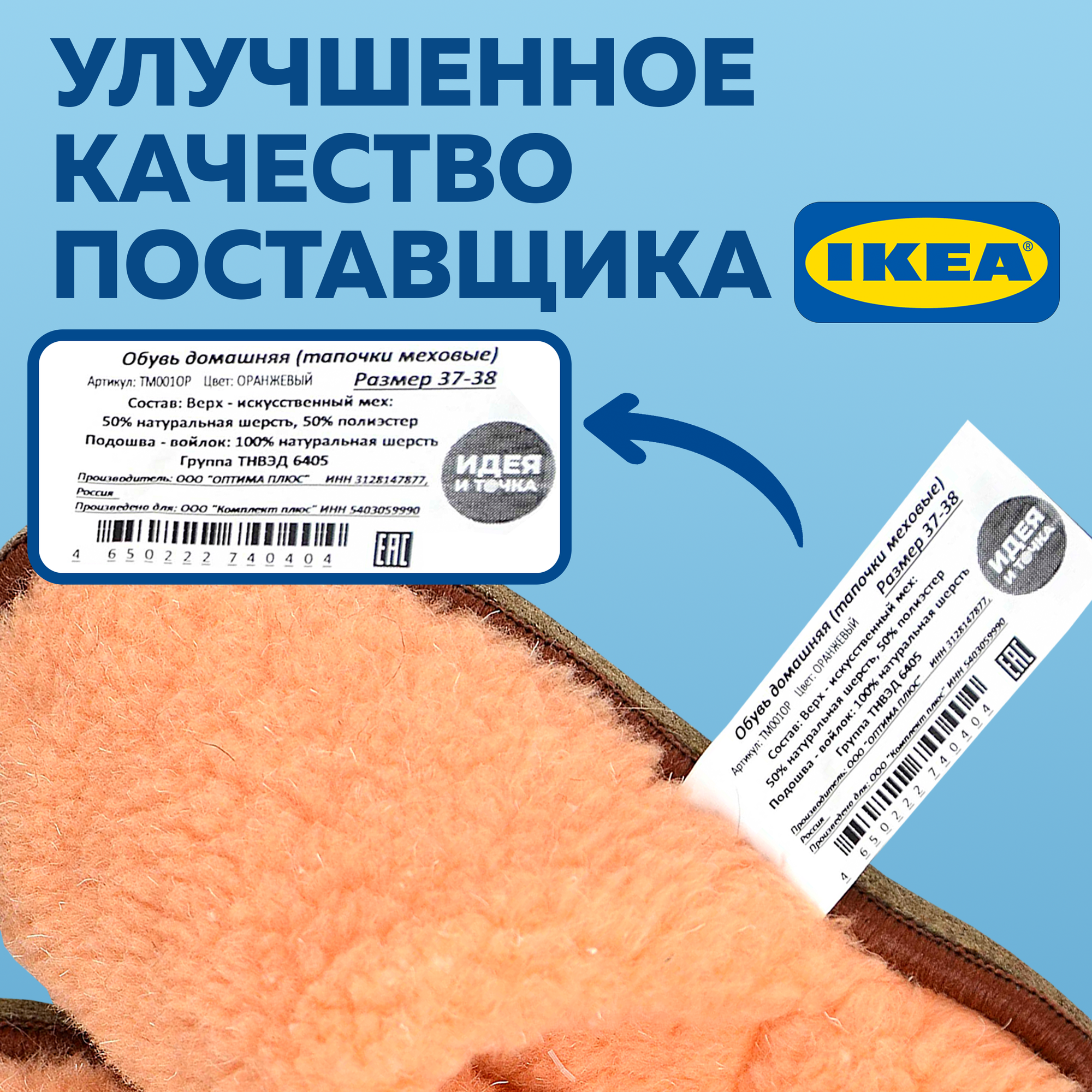 Тапочки меховые LANEUS Идея и точка (аналог икеа феген), тапочки из шерсти, размер 37-38, оранжевый