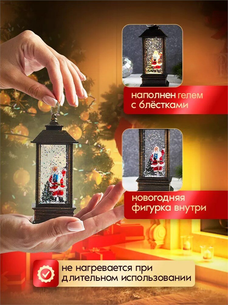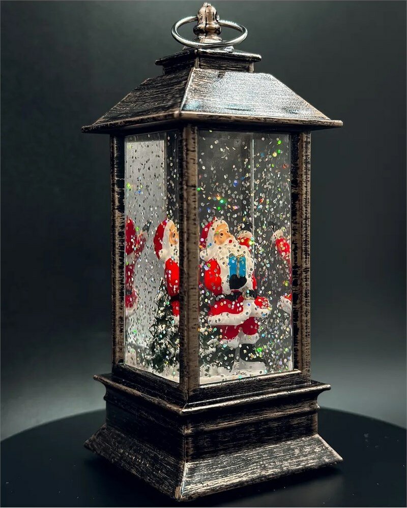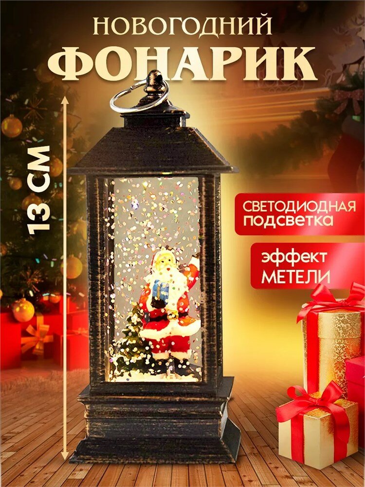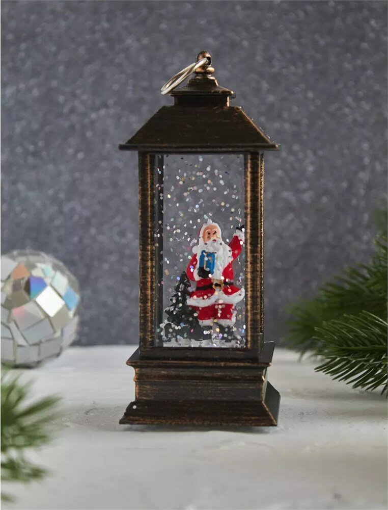 Купить Новогодний декоративный фонарик с подсветкой и снегом | LED-Светильник в ретро-стиле "Дед Мороз с подарком", 13 см 13х5,5х5,5 см Под бронзу