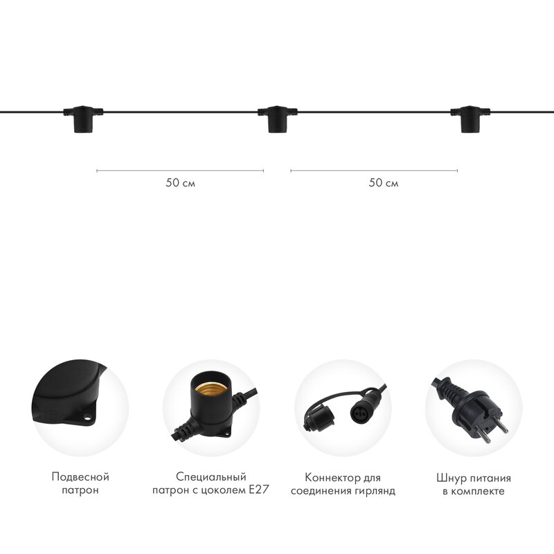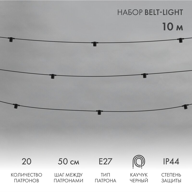Гирлянда белт-лайт 10м 20 патронов E27 без ламп IP44 черный каучук NEON-NIGHT
