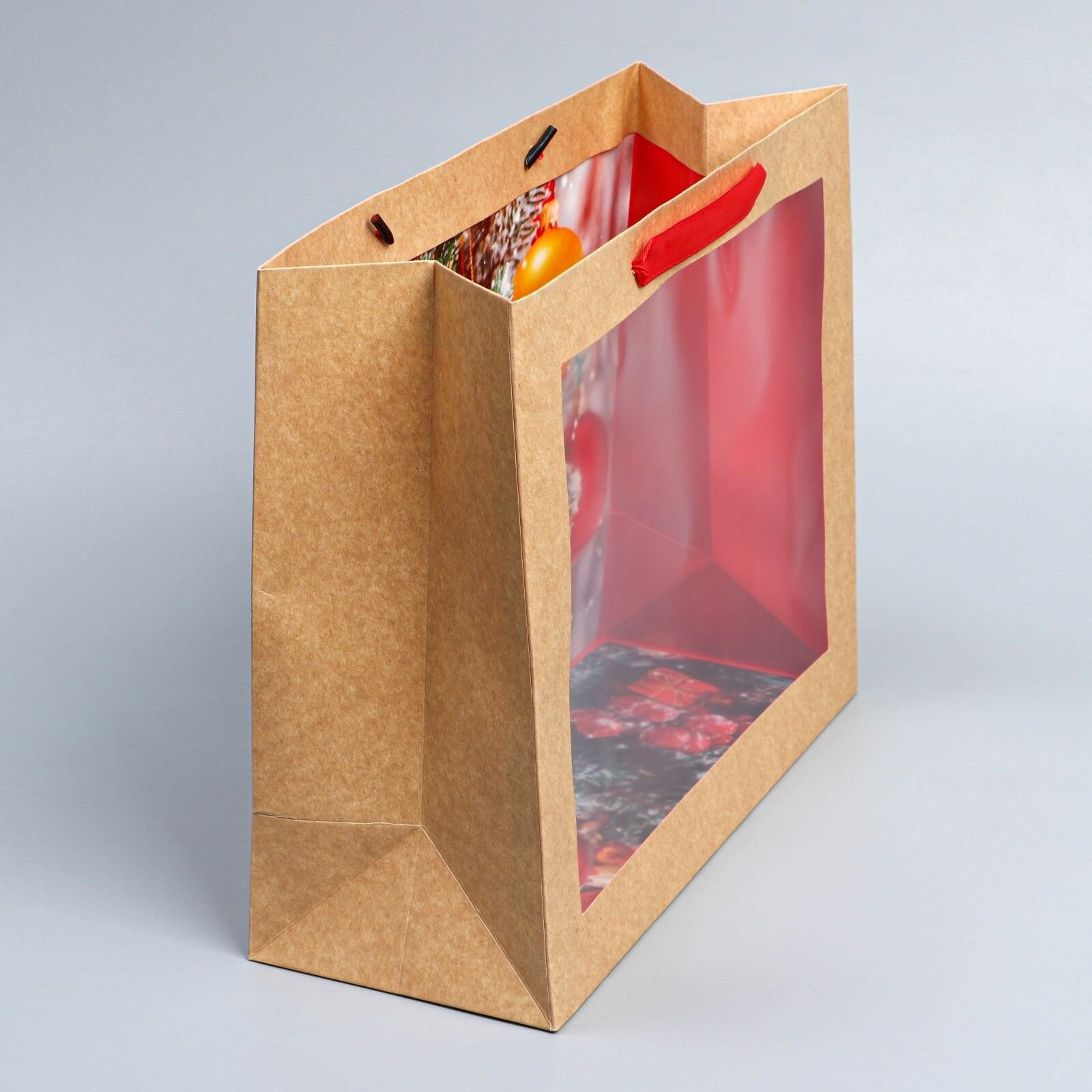 Пакет подарочный новогодний крафтовый с пластиковым окном «Новогоднее чудо», 24 х 20 х 11см