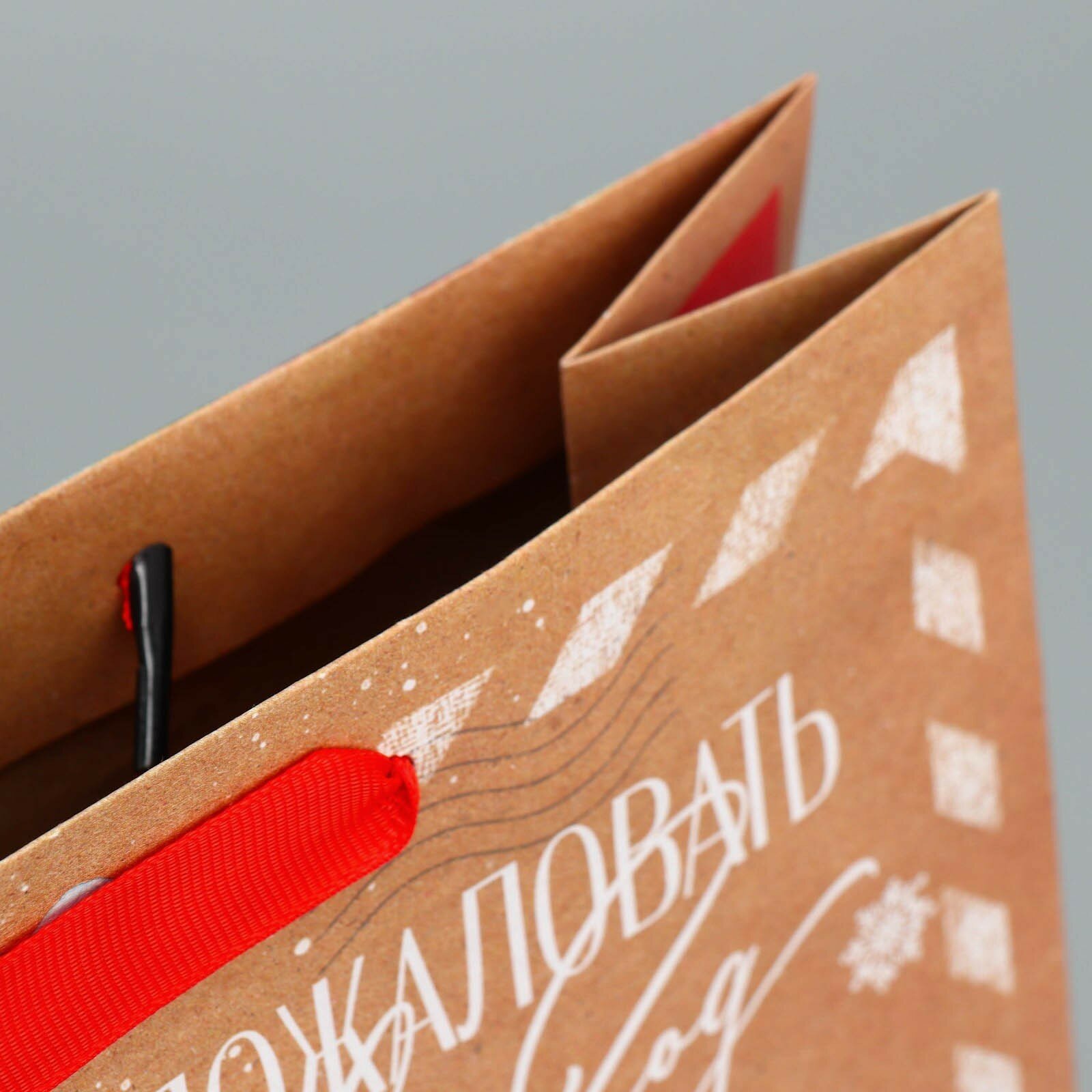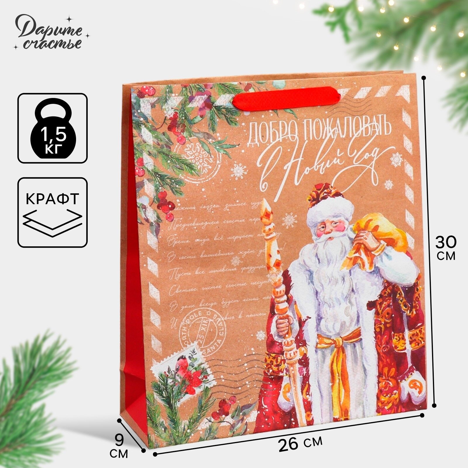 Купить Подарочный пакет новогодний крафтовый вертикальный «Почта Деда Мороза», M 26 х 30 х 9 см, для упаковки подарка на Новый год.