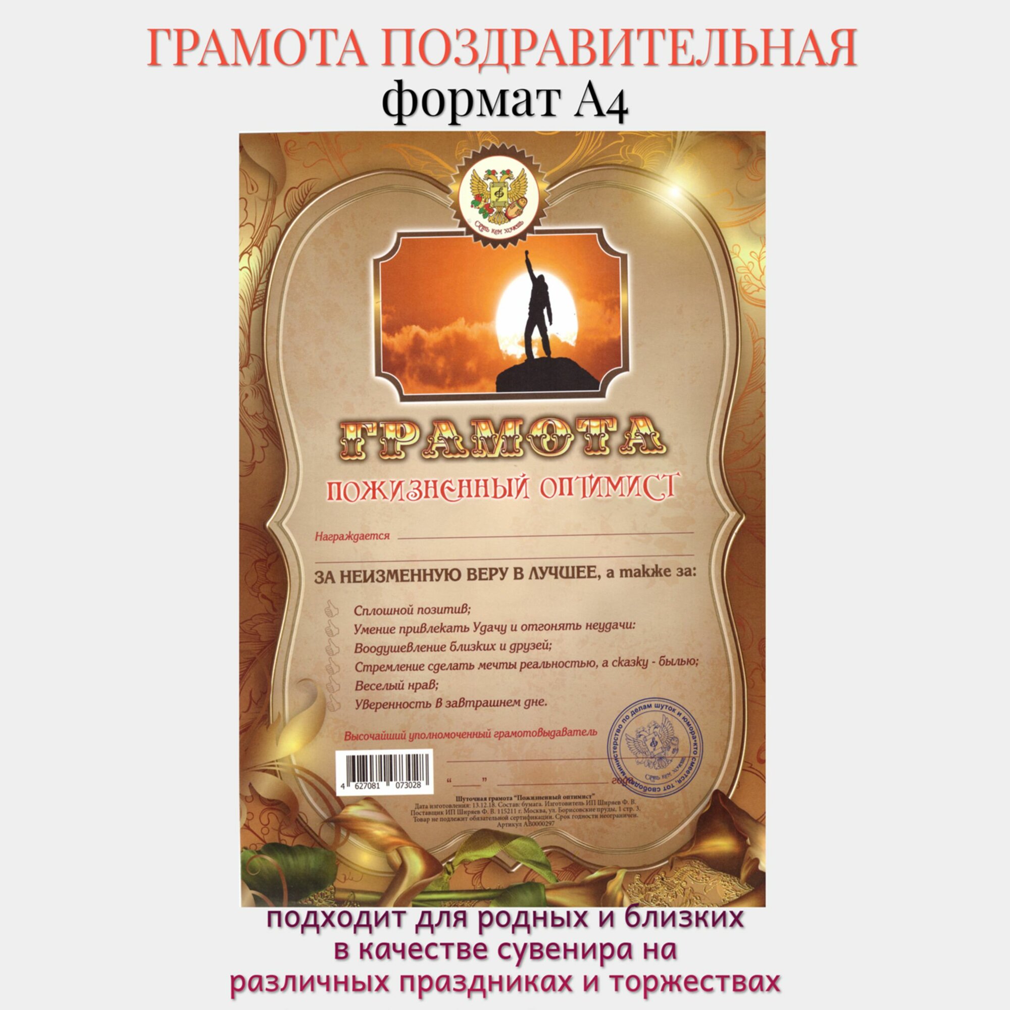Купить Грамота Филькина грамота "Пожизненный оптимист", бумага/картон, А4