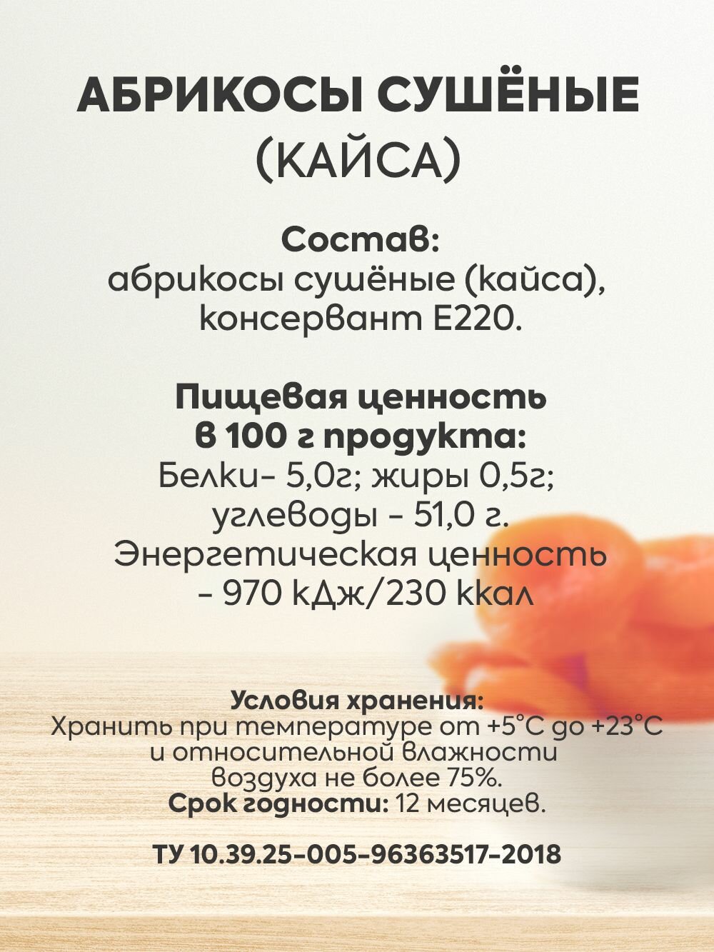 | Состав | абрикосы сушеные (кайса), консервант Е220 |