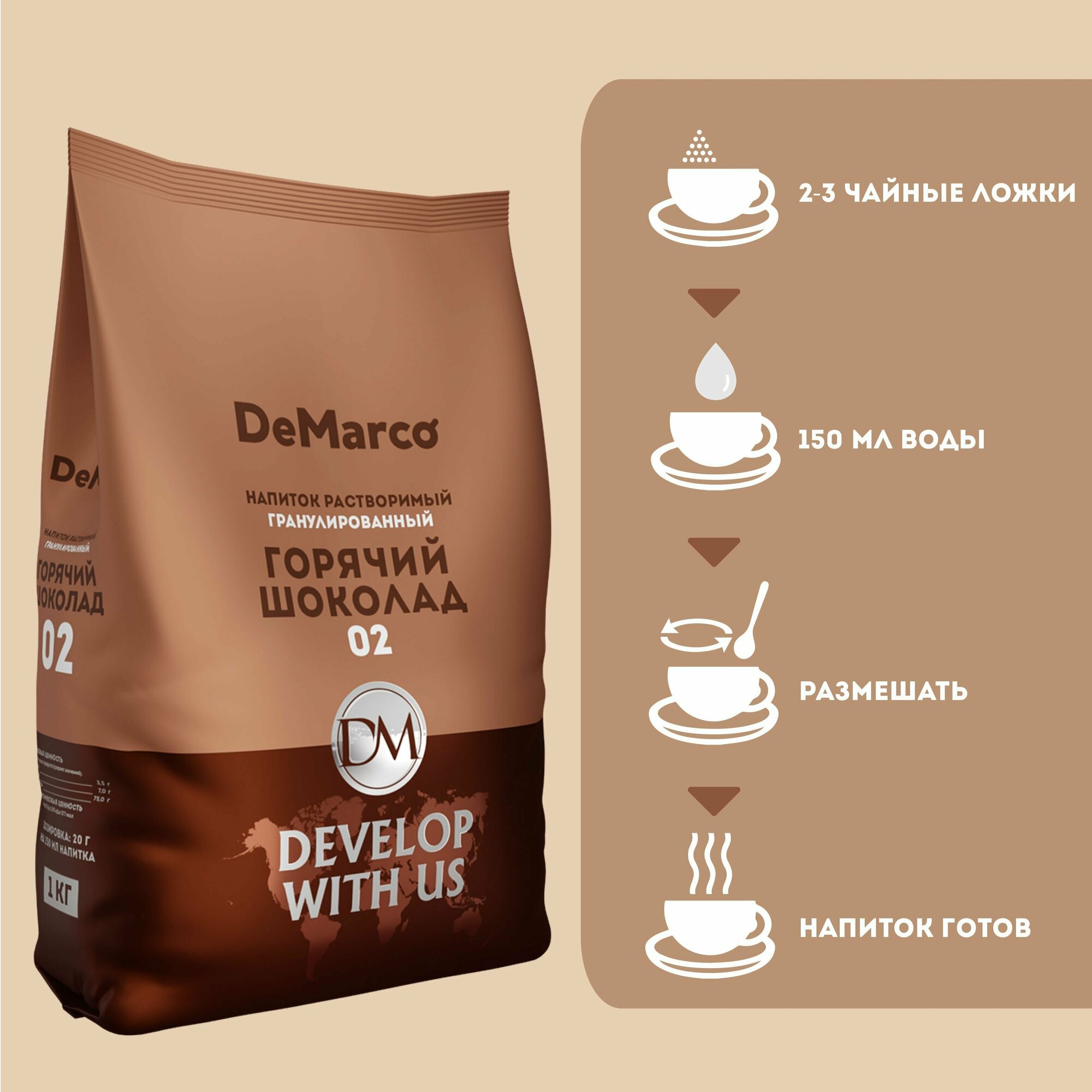 Горячий шоколад 02, DeMarco, гранулированный, растворимый какао напиток, 1 кг