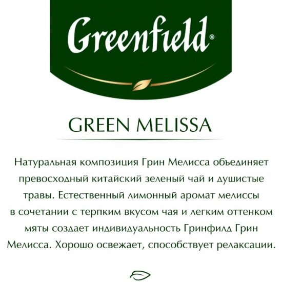 | Состав набора | Гринфилд Грин Мелисса чай зеленый с добавками пакетированный, 100 пакетиков по 1,5 г, в картонной упаковке |