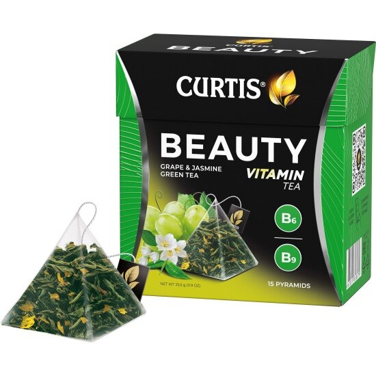 Купить Чай зеленый Curtis "Beauty" с кусочками винограда и витаминами В6 В9 фруктовый ароматизированный 15 пирамидок