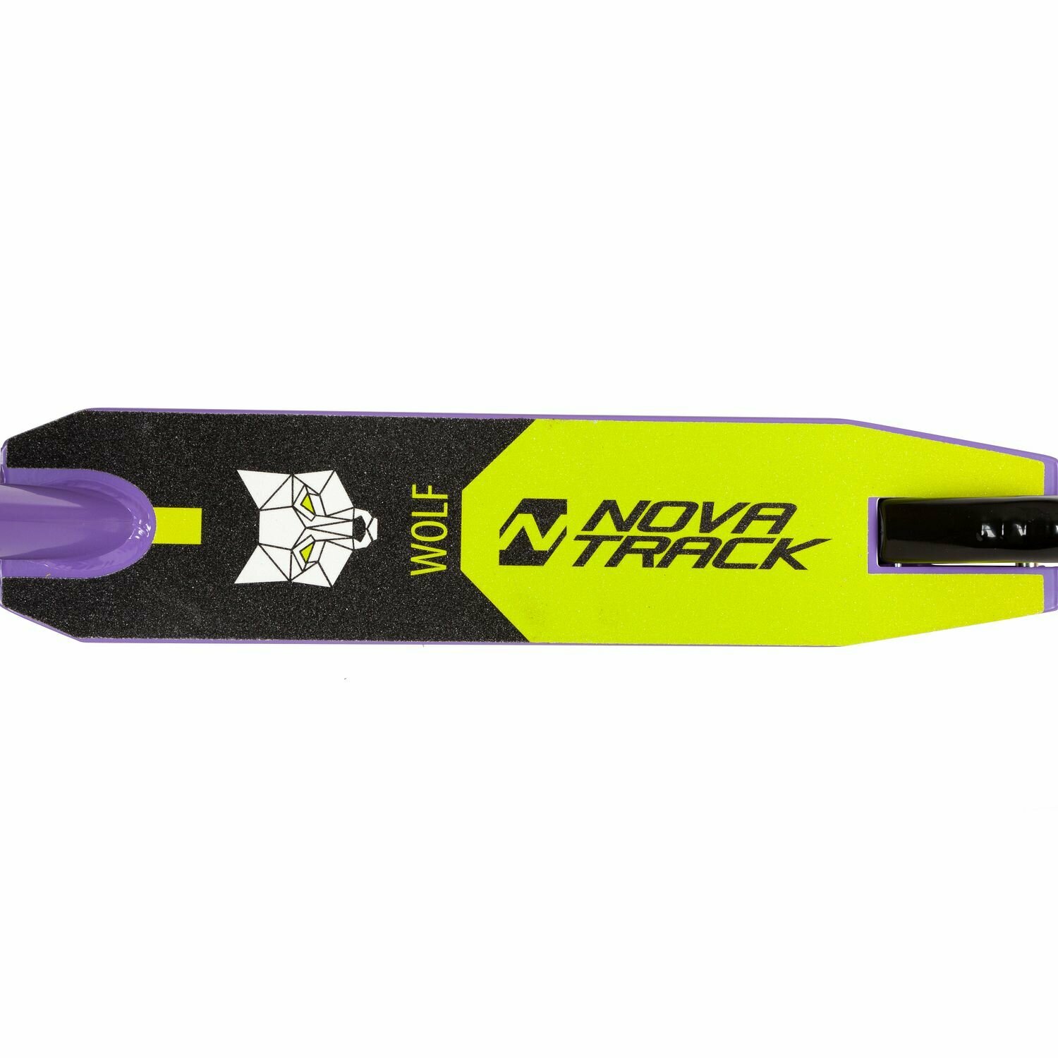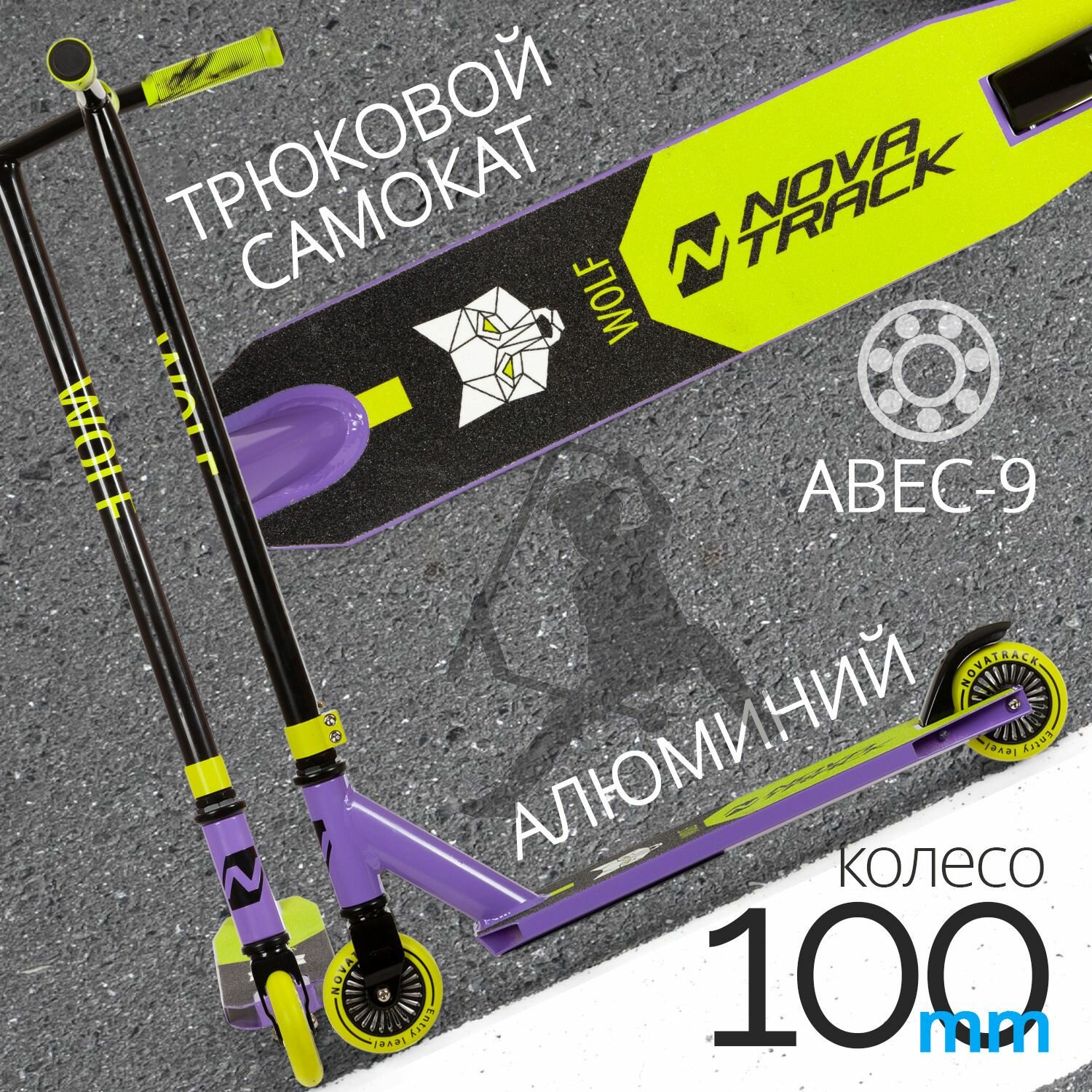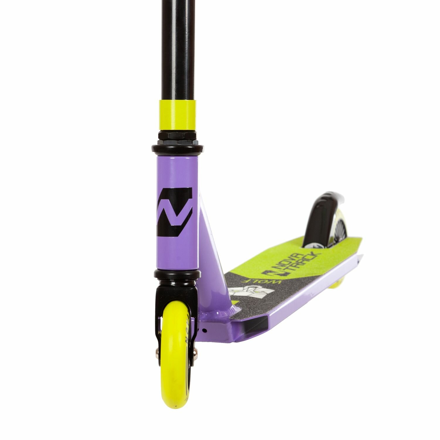Самокат трюковый NOVATRACK WOLF'60, PU колеса с пластик.ободом плотностью 84A, abec7, зажим 2 болта, стальной руль,черно-фиолетовый