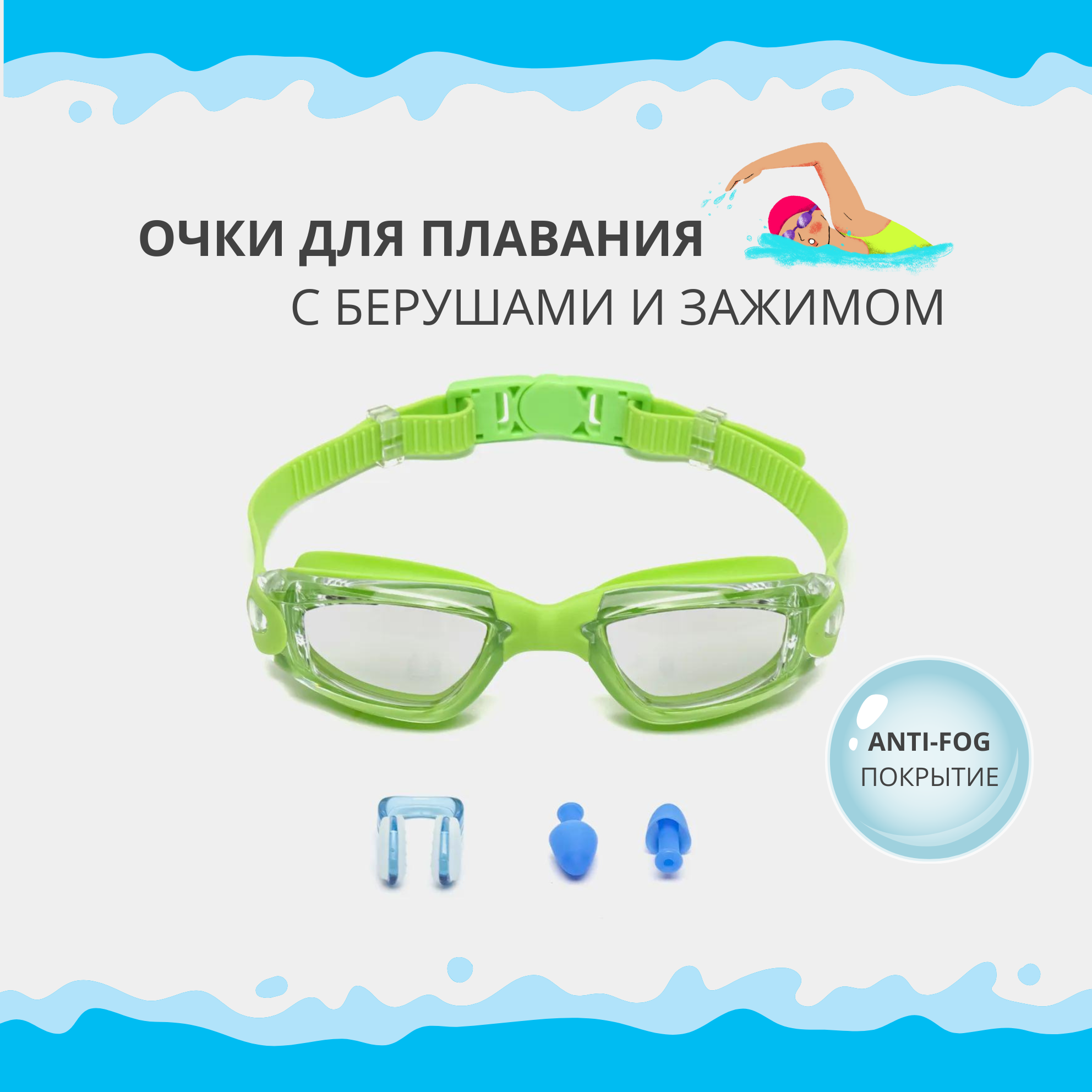 Купить Очки для плавания и бассейна, для моря, с берушами и зажимом для носа (зеленый)