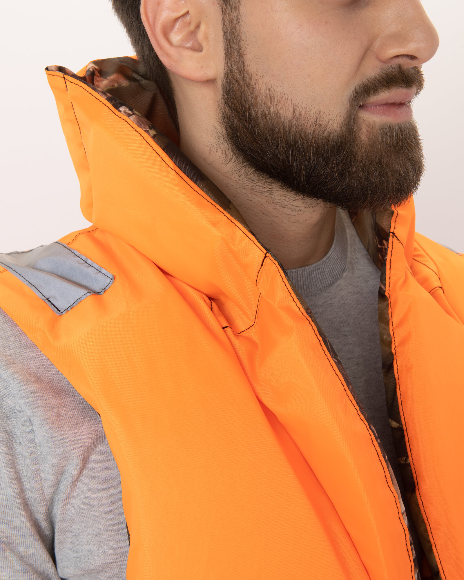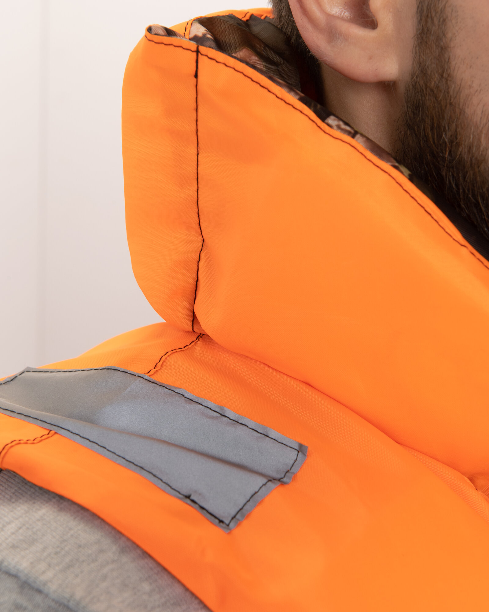 Спасательный жилет взрослый двусторонний Huntsman ПР с карманами, светоотражателями: сертификат гимс, ГОСТ, цвет оранжевый/лес (р.44-48/60 кг)