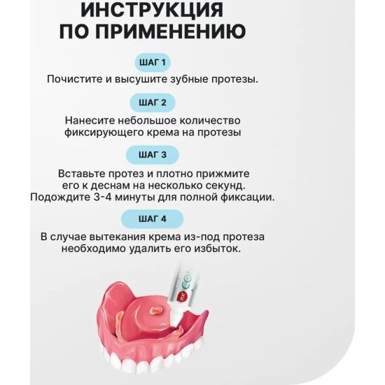 | Способ применения | Верхний протез: Нанесите фиксирующий крем длинной непрерывной полоской. Добавьте две короткие полоски на середину протеза. Нижний протез: Нанесите крем длинной непрерывной полоской. Частичный протез: Нанесите фиксирующий крем в две короткие полоски. Прополощите полость рта, пред тем как установить зубной протез. Зафиксируйте зубной протез в полости рта, плотно прижав его на несколько секунд. Подождите 3-4 минуты до полной фиксации. В случае вытекания крема из-под протеза, необходимо удалить его избыток. В редких случаях может наблюдаться индивидуальная непереносимость продукта. При возникновении неприятных ощущений прекратите использование крема и проконсультируйтесь с врачом. Случайное проглатывание крема при установке протеза безопасно для организма. |