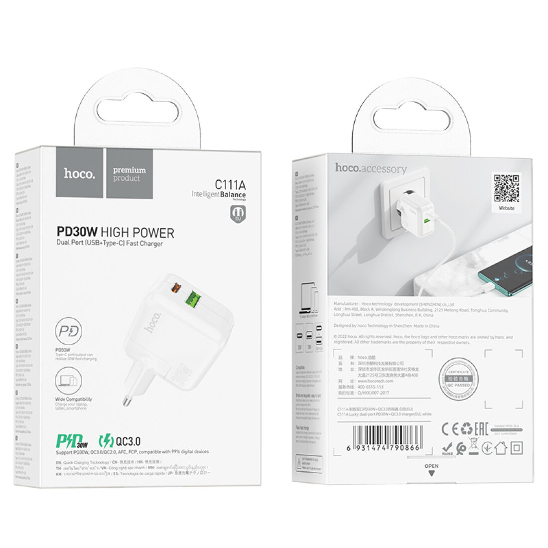 Сетевое зарядное устройство Hoco C111A PD30W+QC3.0 White
