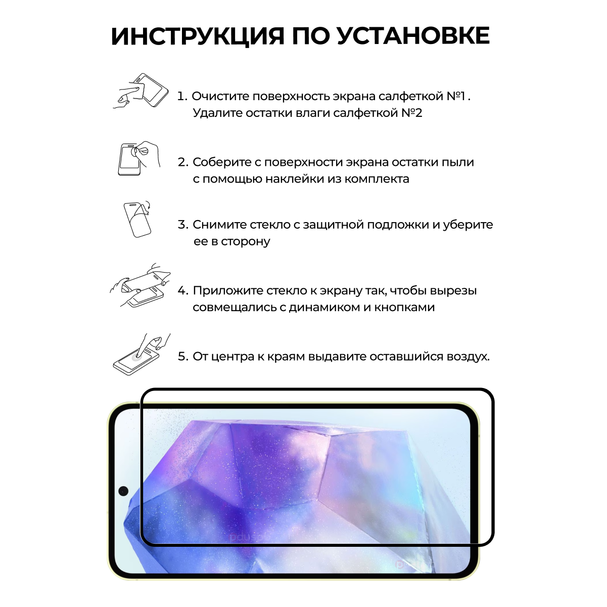 | Подробная комплектация | Комплектация: Надежная упаковка, защитное стекло, сухая салфетка из микрофибры, влажная салфетка для обезжиривания, стикеры для удаления пыли |