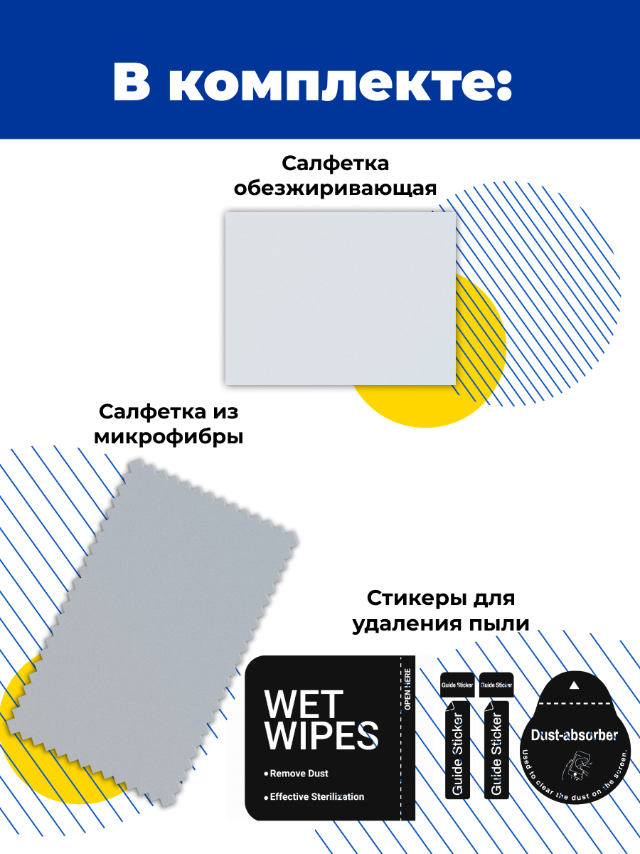 | Подробная комплектация | В комплект входит: стикеры для удаления пыли - 1 шт.; влажная салфетка - 1 шт.; сухая салфетка - 1 шт. |