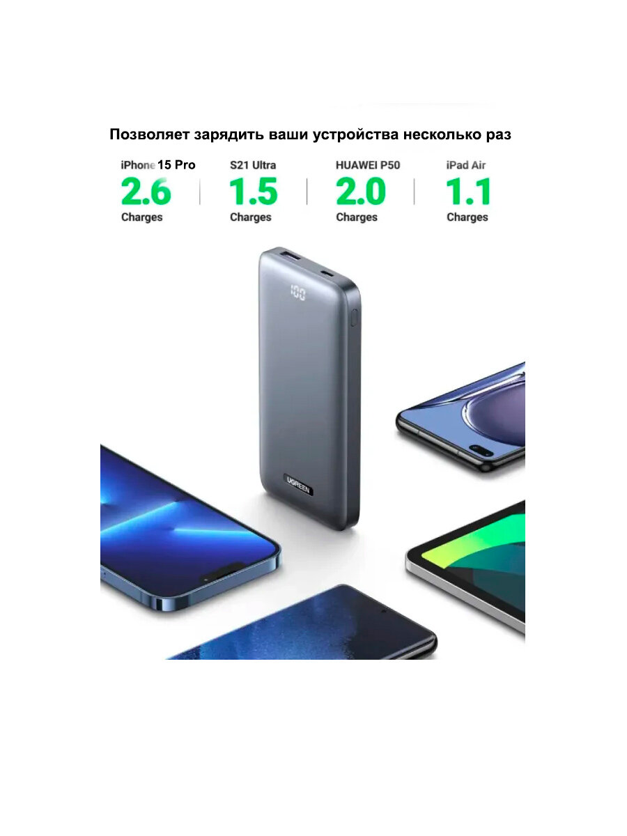 Внешний аккумулятор UGREEN PB198 10000mAh Ultra Slim Quick Charging 20W, USB A + USB C серый (60689)/Повербанк