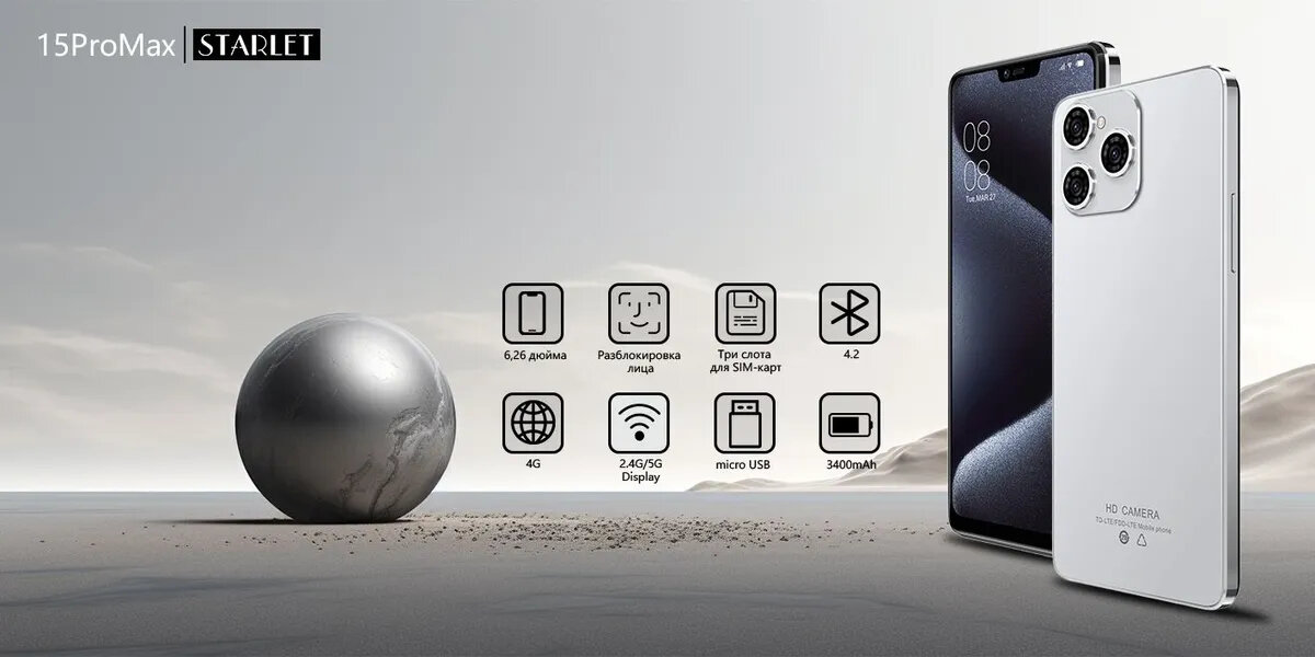 Смартфон STARLET 15 PRO MAX 4/128 ГБ, Dual nano SIM, Мобильные телефоны, Разблокировка по лицу,2280*1080, Smart phone