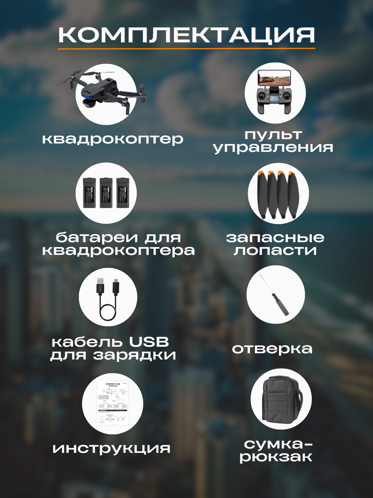 | Комплектация | Дрон; - Пульт; - Аккумулятор (2 штуки); - Радиолокационная установка; - Зарядный кабель USB; - Запасные лопасти; - Запасные винты; - Отвертка; - Сумка. |