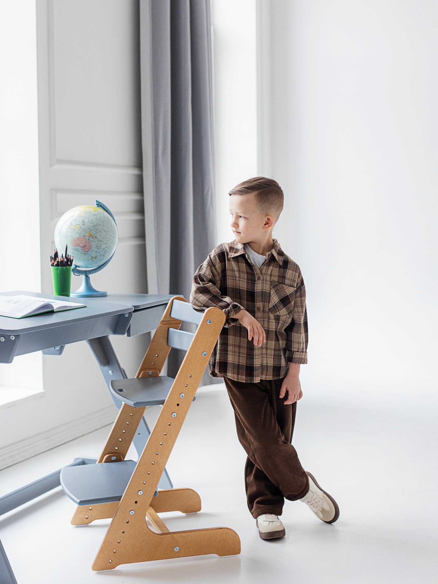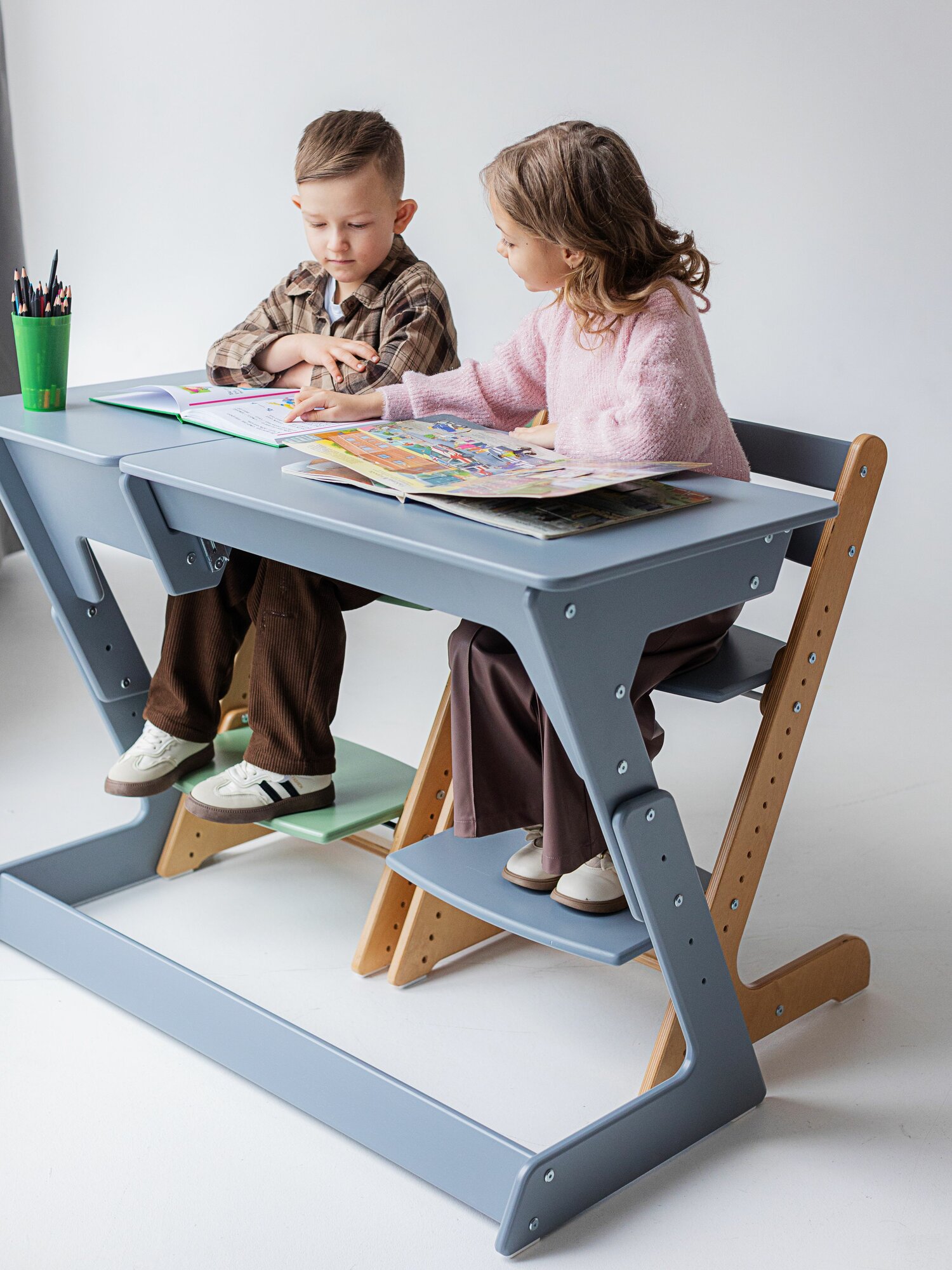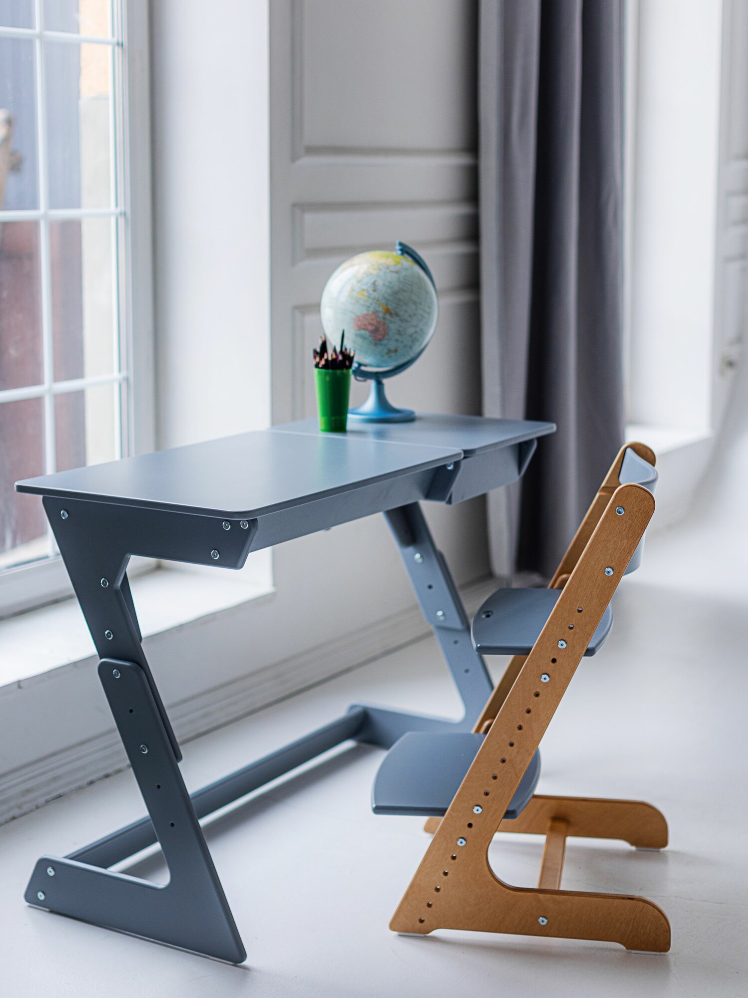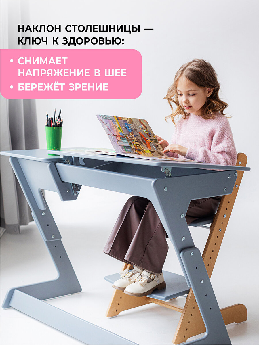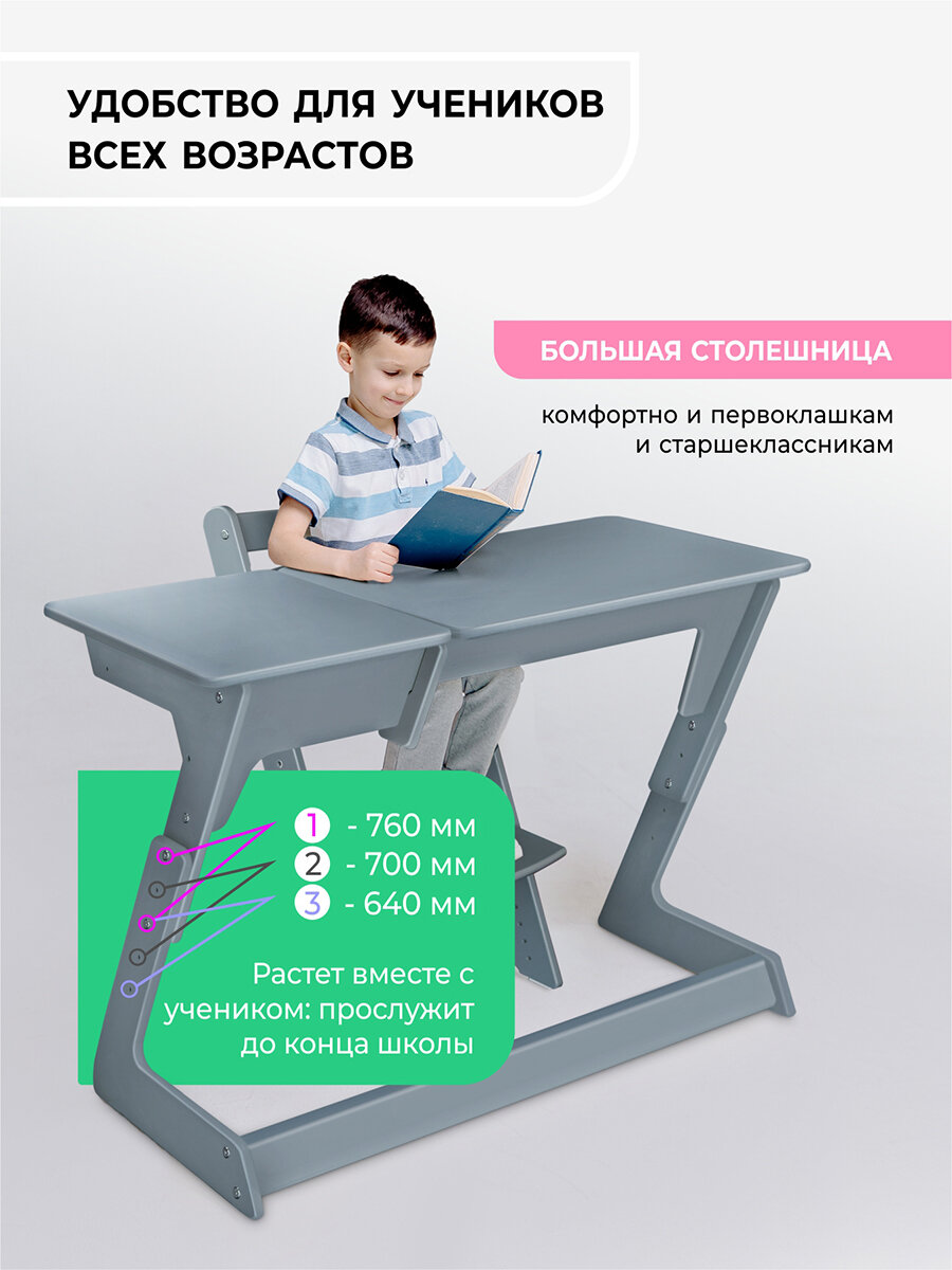 Растущая парта для школьника Rumbik Smart серая, детский деревянный письменный стол с регулировкой высоты