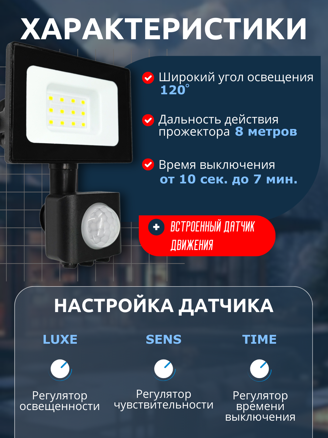 "Прожектор с датчиком движения" - 20Вт, 6500K, угол обзора - 120 градусов, IP65, черный