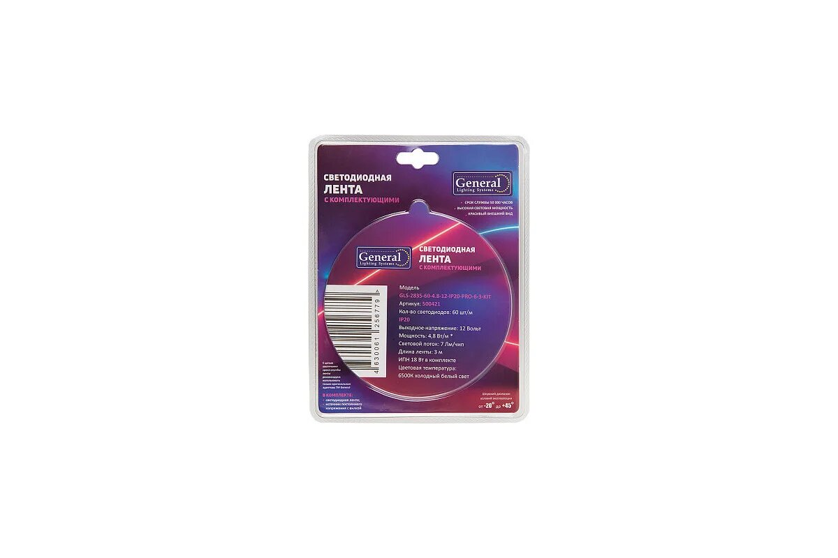 Купить Светодиодная лента General Lighting Systems 3 м с адаптером, 4,8Вт/м, 12В, 8мм, IP20, 6500К, холодный белый GLS-2835-60-4.8-12-IP20-PRO-6-3-KIT 500421