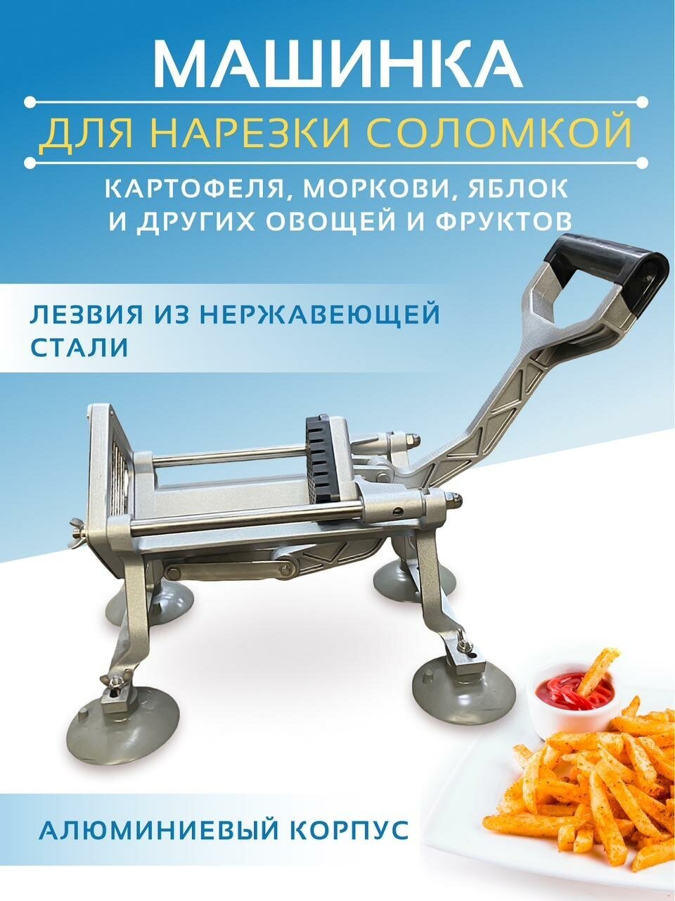 | Дополнительная информация | В основании картофелерезки имеется резиновая ножка с вакуумной присоской, предотвращающей скольжение на рабочей поверхности. Благодаря этому, использование картофелерезки не составит особого труда. |