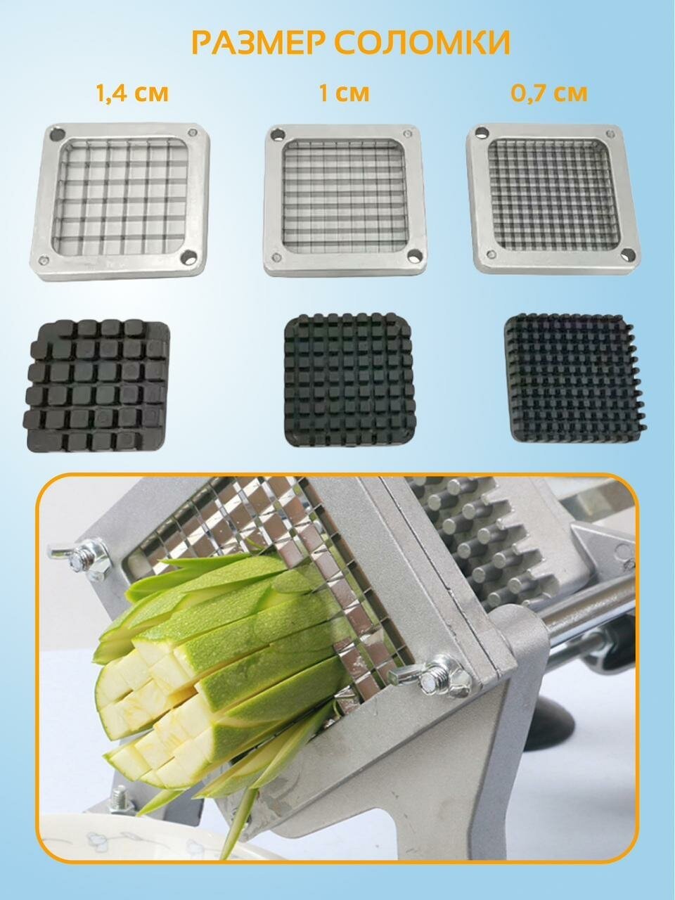| Комплектация | 2 ножа с разными размерами ячеек: 1 нож: 0,8 см; 2 нож: 1,1 см. . |