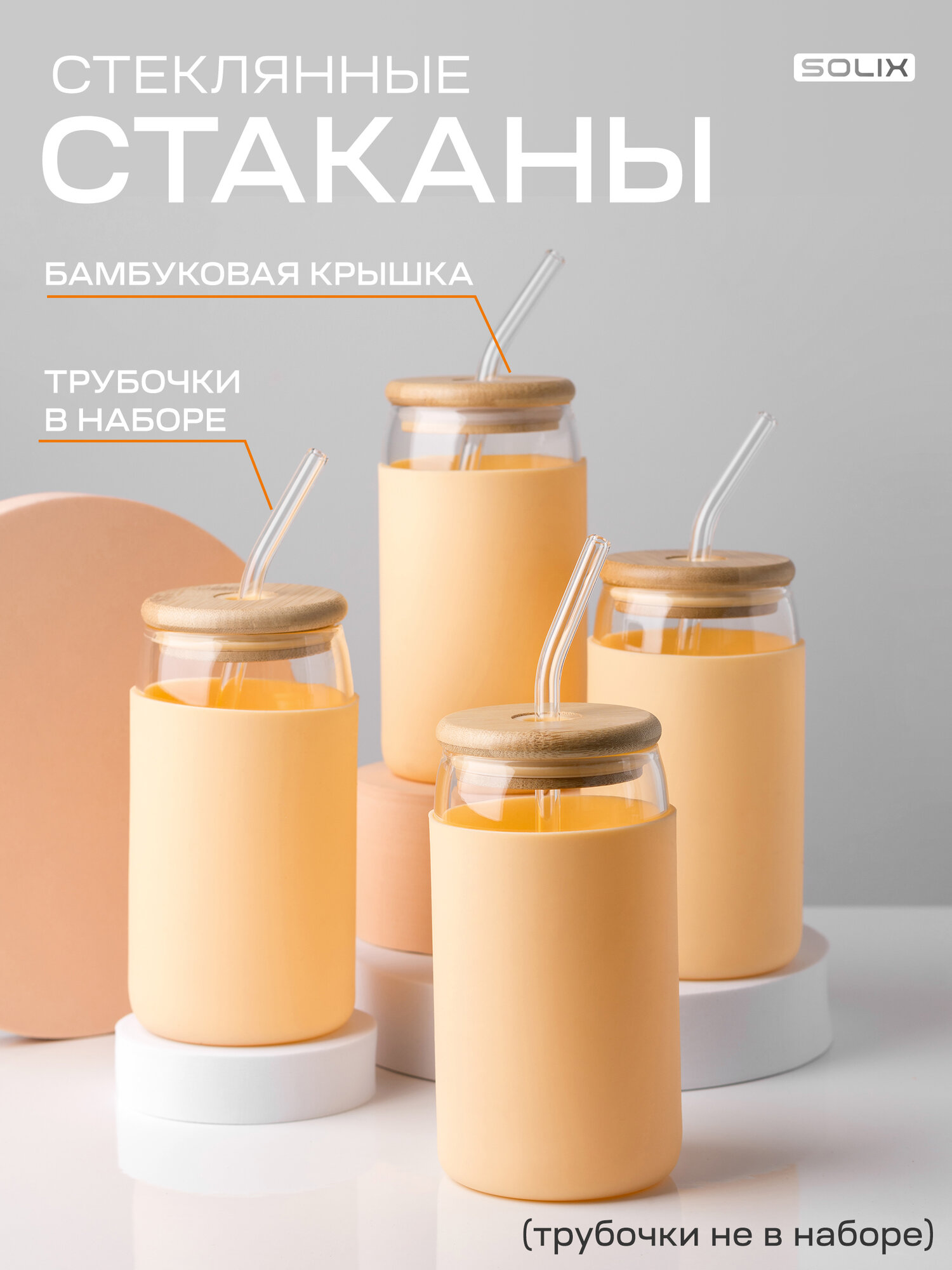 Купить Стеклянные стаканы с бамбуковой крышкой, бежевый, 4шт