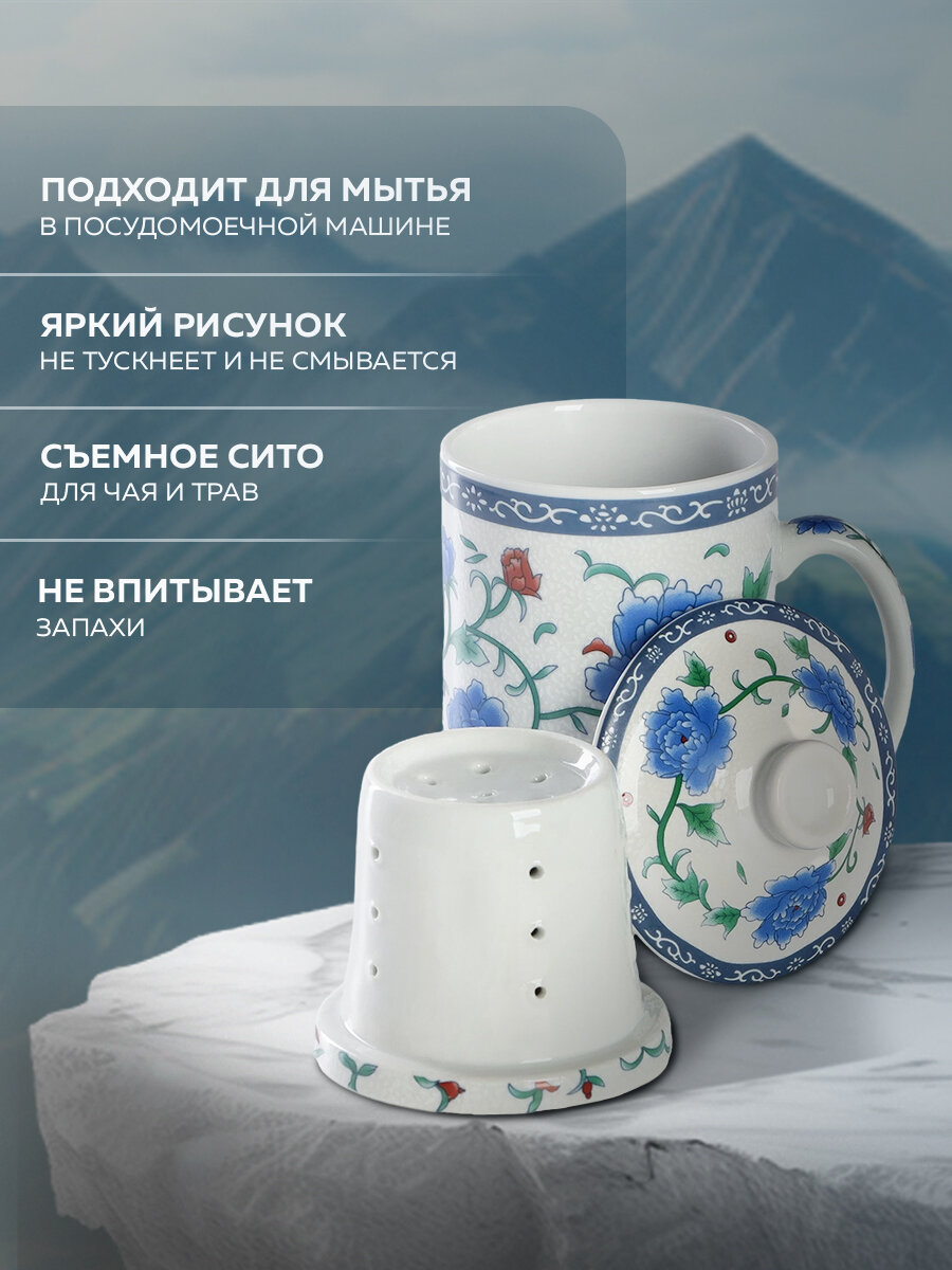 Кружка керамическая с крышкой и ситом «Цветение роз», 360 мл, цвет белый интересное: