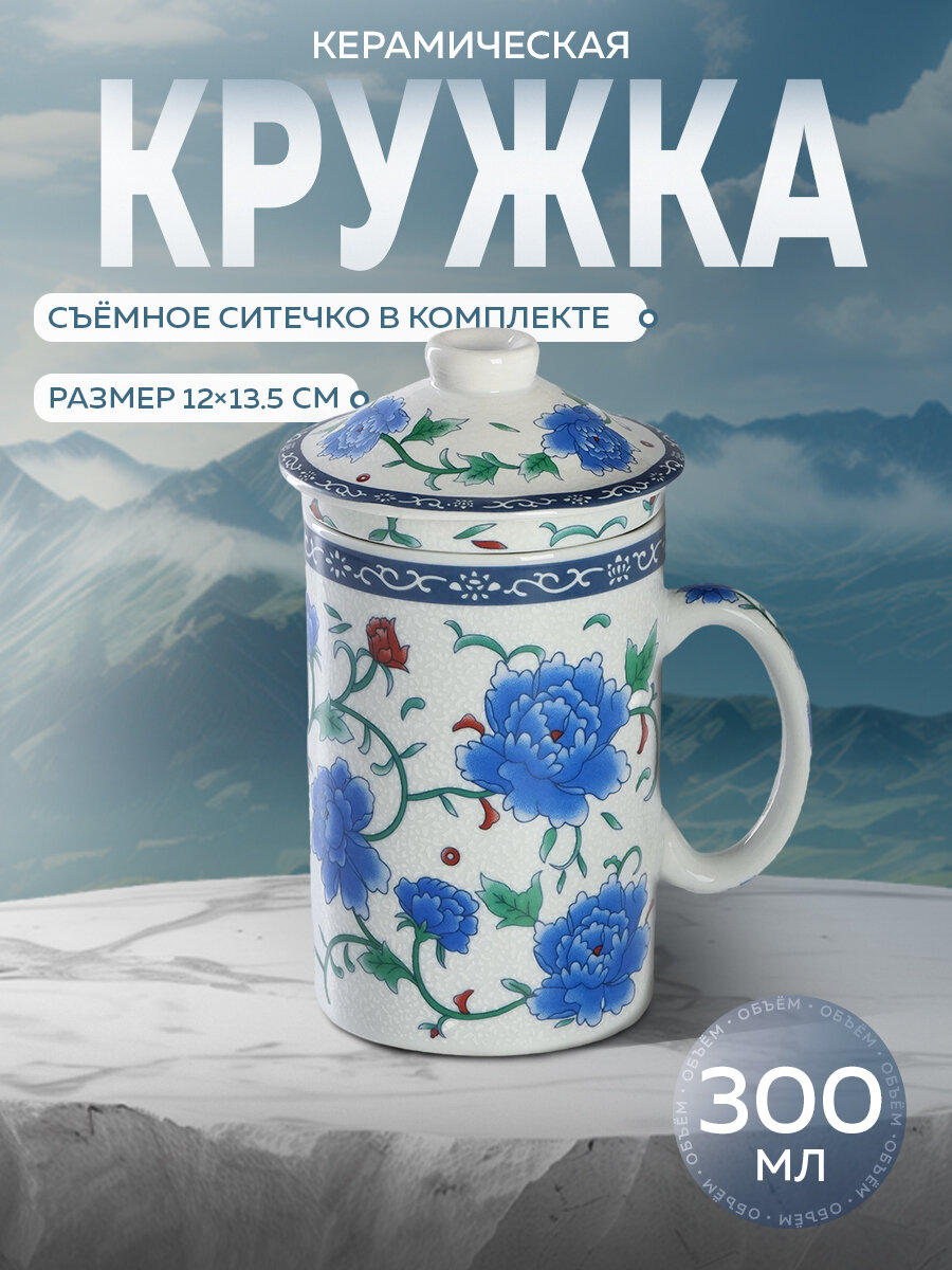Кружка керамическая с крышкой и ситом «Цветение роз», 300 мл