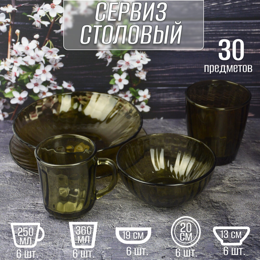 Сервиз столовый стекло, 30 предметов, на 6 персон, Elica Волна дымка, 62106, дымчатый интересное: