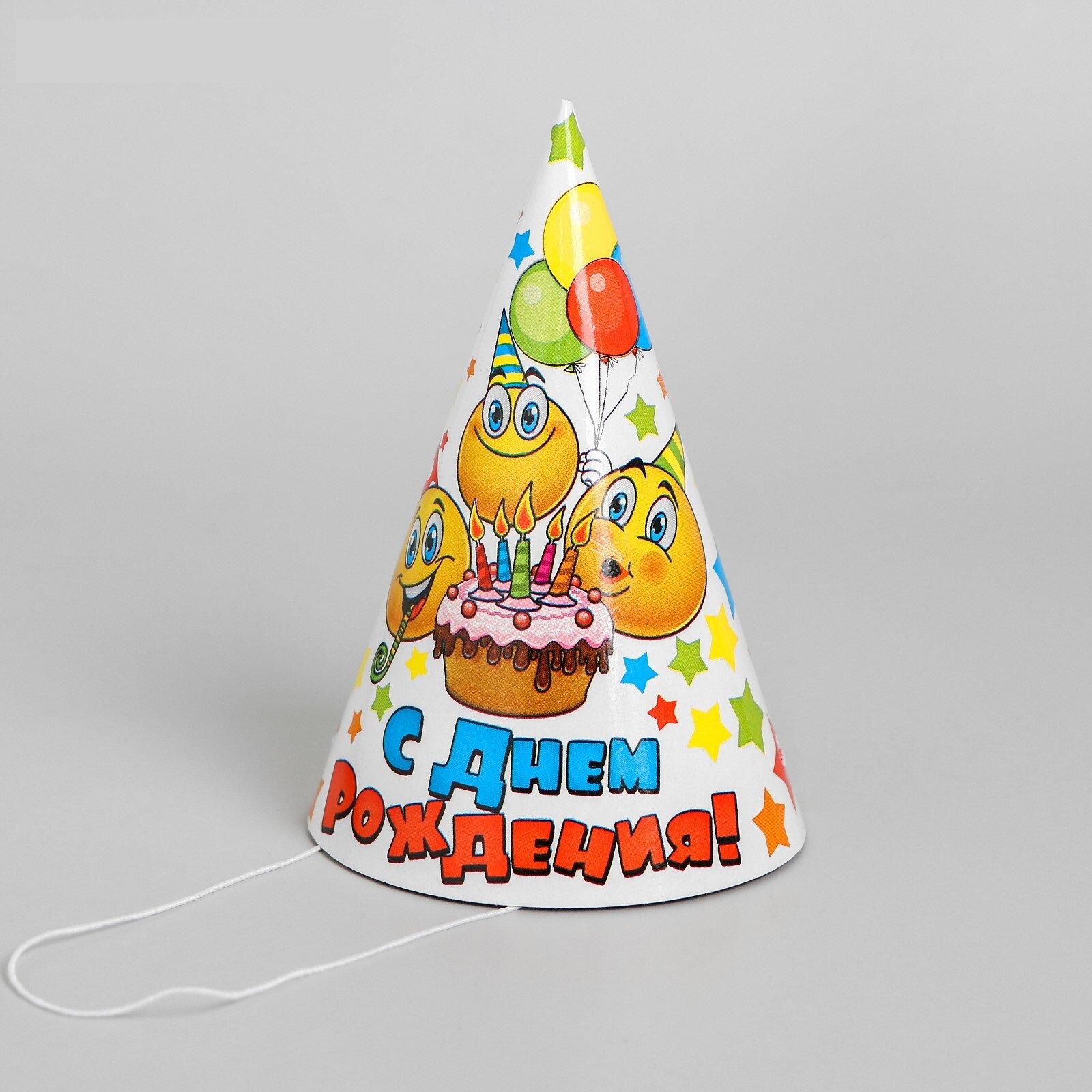 Купить Колпак праздничный бумажный "С Днем Рождения", смайлы и звезды, набор из 6 штук, размер: 16 см, для детей и малышей