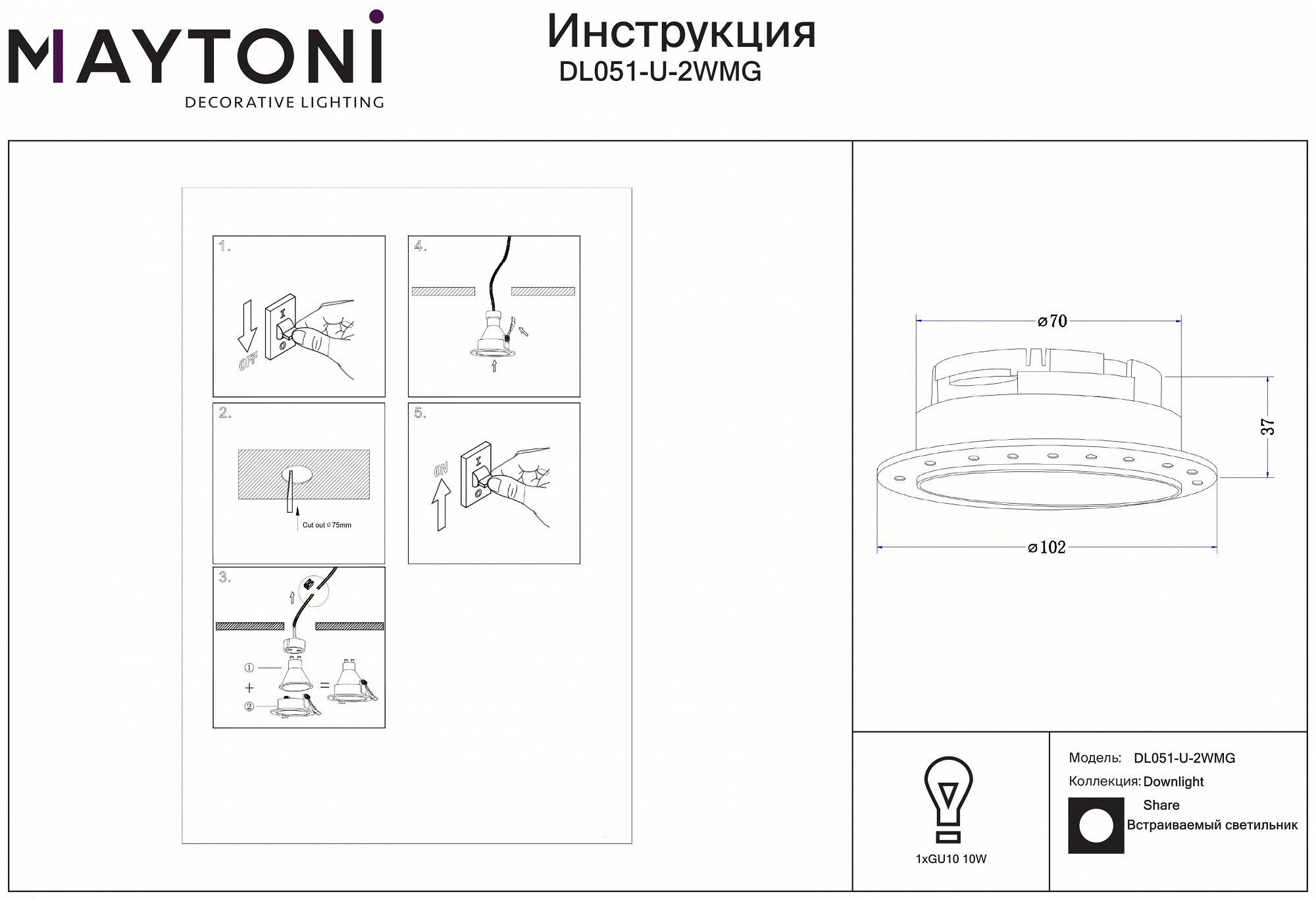 Встраиваемый светильник Maytoni Share DL051-U-1B, GU10, кол-во ламп:1шт, Черный